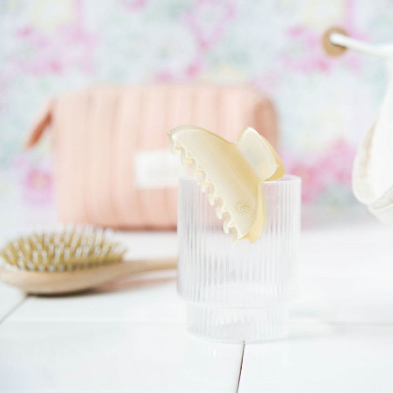 Cette grande pince de couleur ivoire de la marque Bachca a une jolie finition Opaline. Elle est idéale pour maintenir les cheveux en demi queue ou en chignon. Disponible également en coloris vert d'eau.