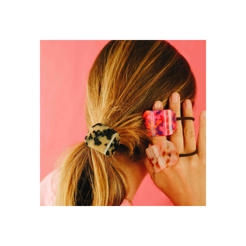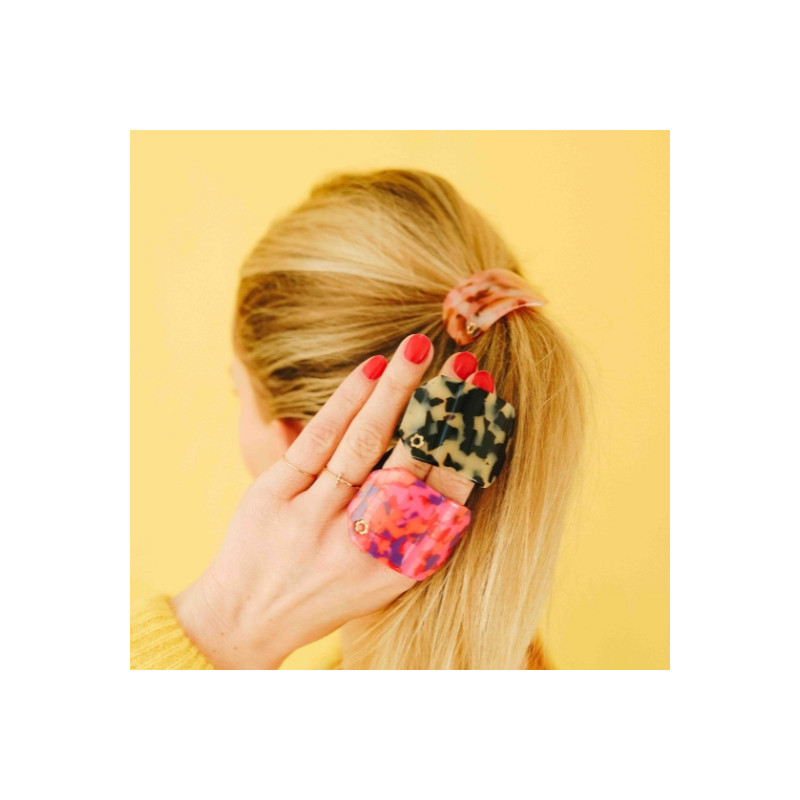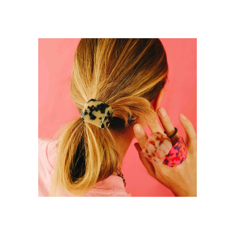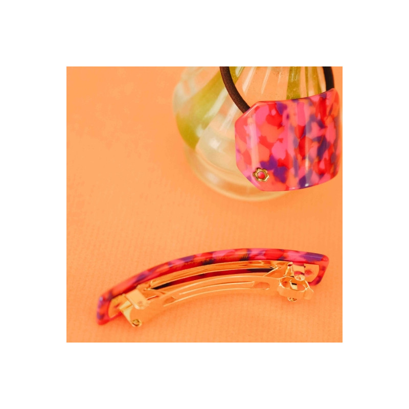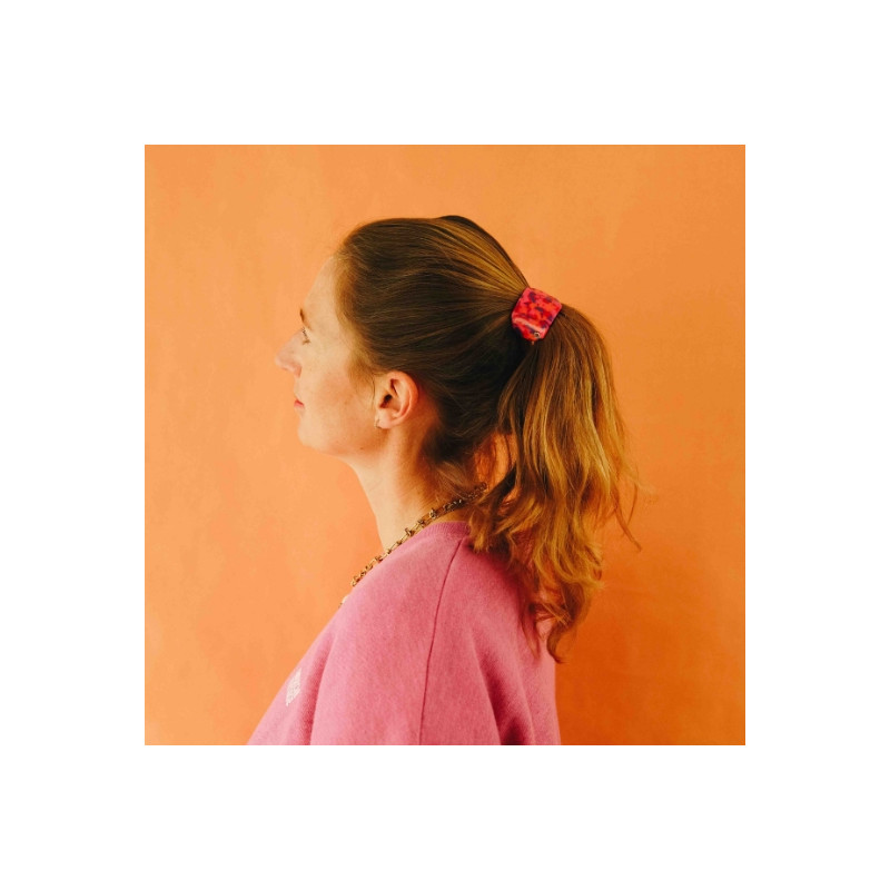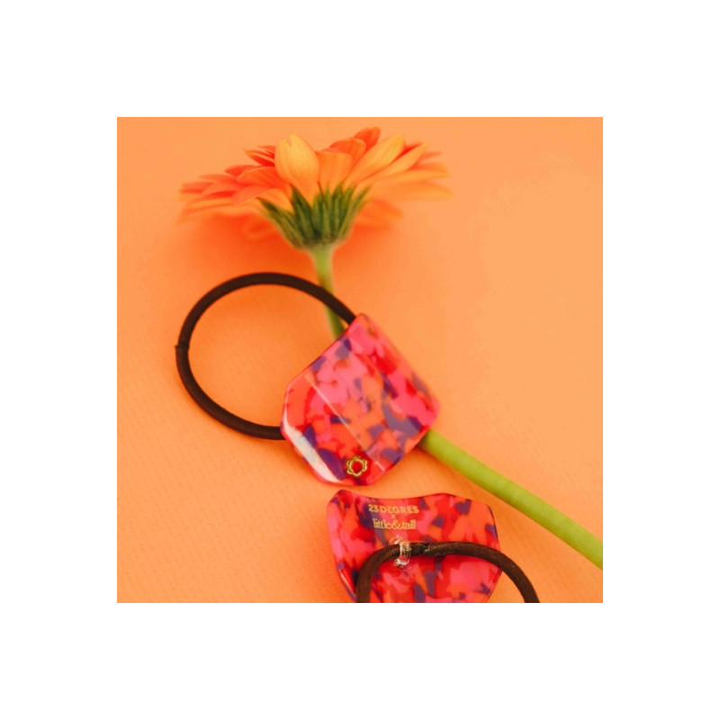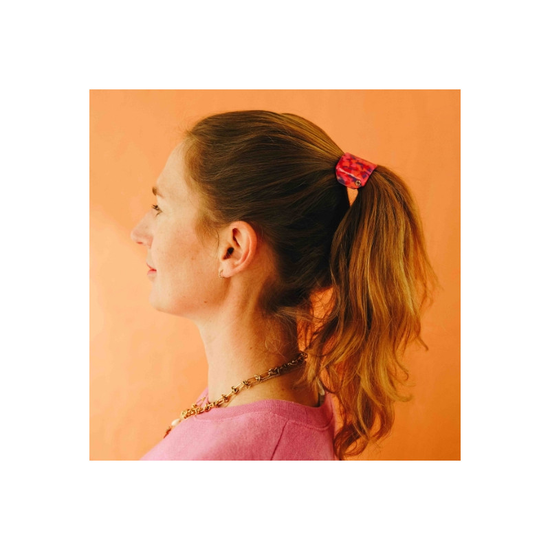 L'élastique plaque, parfait pour des coiffures en queue de cheval ou en demi-queue, se distingue par sa plaque en acétate de cellulose écaille aux teintes violet, rose et orange. Un détail subtil : un marquage doré représentant notre emblématique fleur.