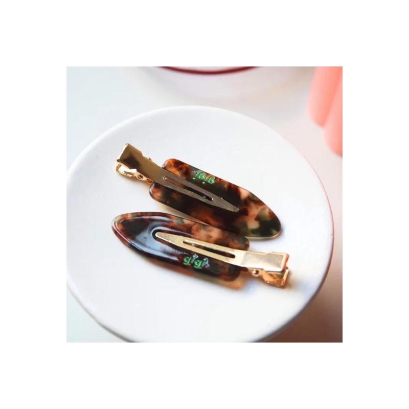 Les barrettes à cheveux "écailles ambre" Gigi Paris sont idéales pour protéger vos cheveux de votre maquillage et démaquillage, préparer votre frange rideau, ou encore donner le pli que vous souhaitez. Fabriquées en résine avec un motif écaille de tortue, ces barrettes allient élégance et fonctionnalité, idéales pour toutes les occasions.