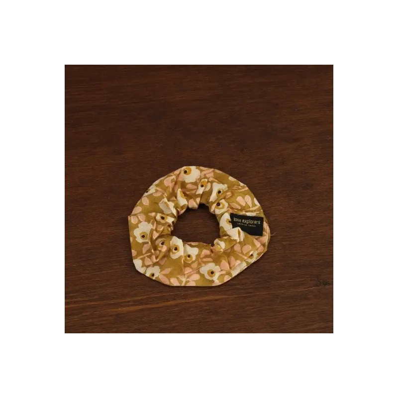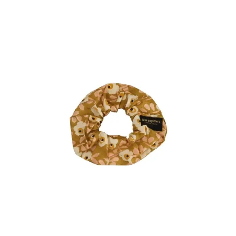 Chouchou flower seventies Love Explorers en coton résistant, au style rétro et joyeux. Fabrication artisanale avec possibles irrégularités naturelles.