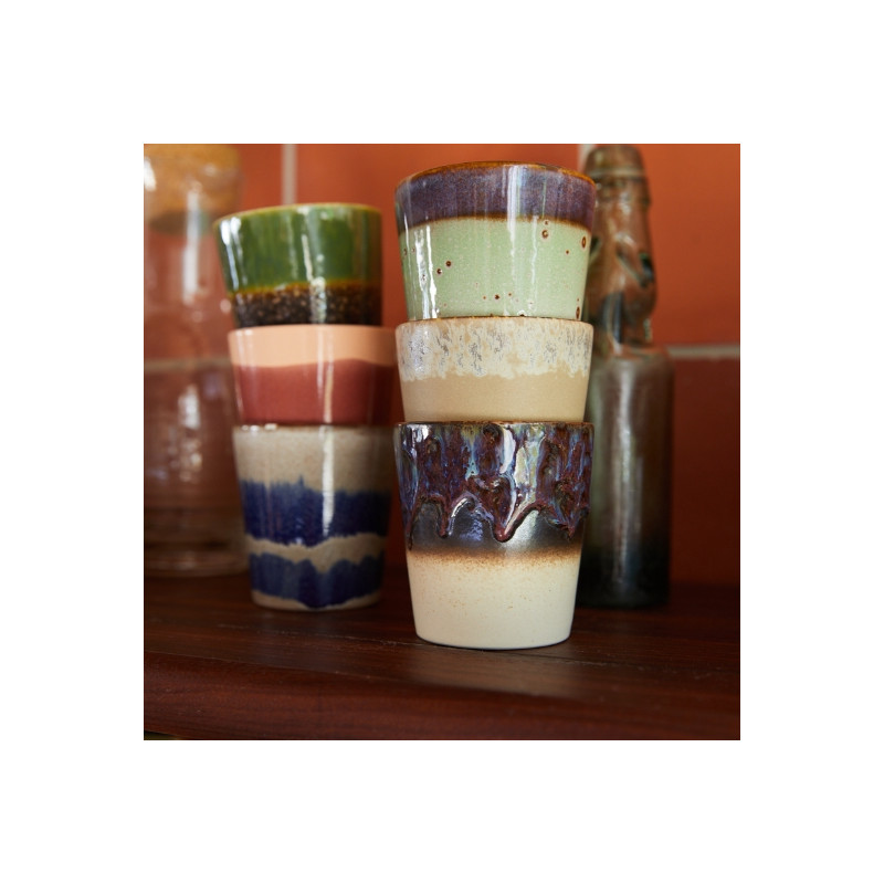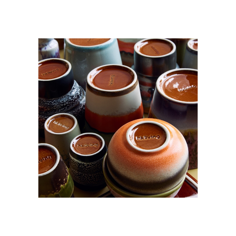 Inspirée par les éléments terreux et les couleurs naturelles des années 70, notre gamme de tasses à café incarne une esthétique décontractée et intemporelle. Chaque pièce est façonnée avec soin et finie à la main, ce qui la rend unique avec des surfaces texturées et des compositions de couleurs passionnantes.