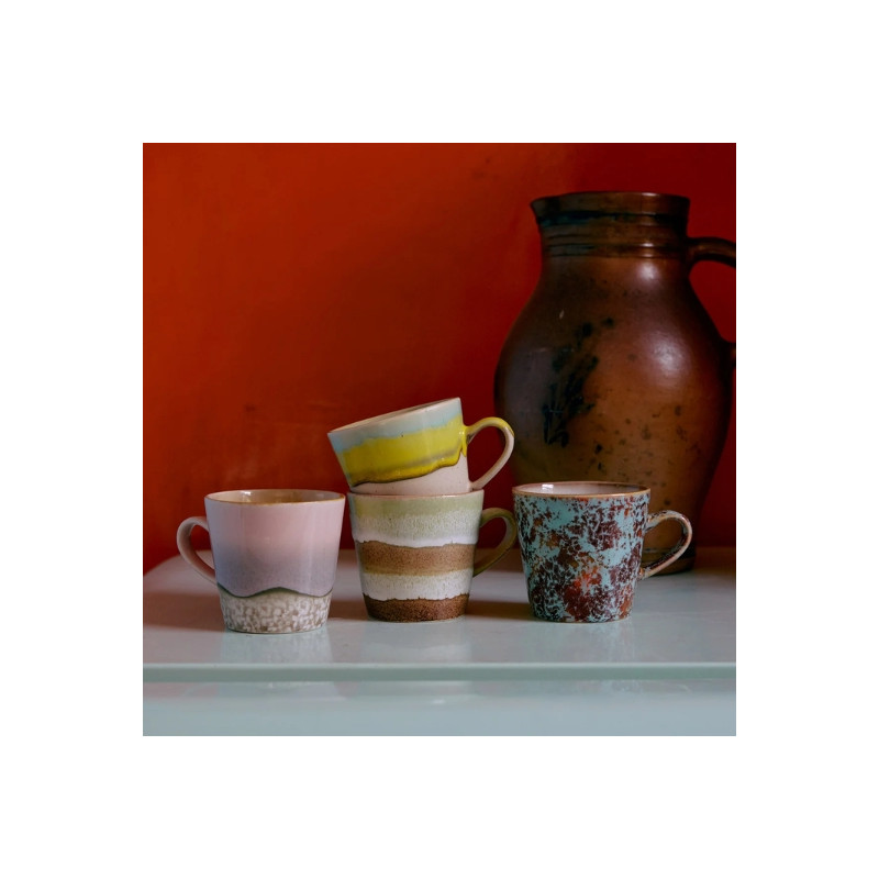 Les tasses de chez HK Living issues de la collection années 70 rendent hommage aux mouvements artistiques qui ont marqué cette époque : pop art, surréalisme, expressionnisme… Chaque tasse mêle couleurs vibrantes, motifs inattendus et émaux texturés, faisant de chaque pièce une petite œuvre d’art unique.