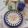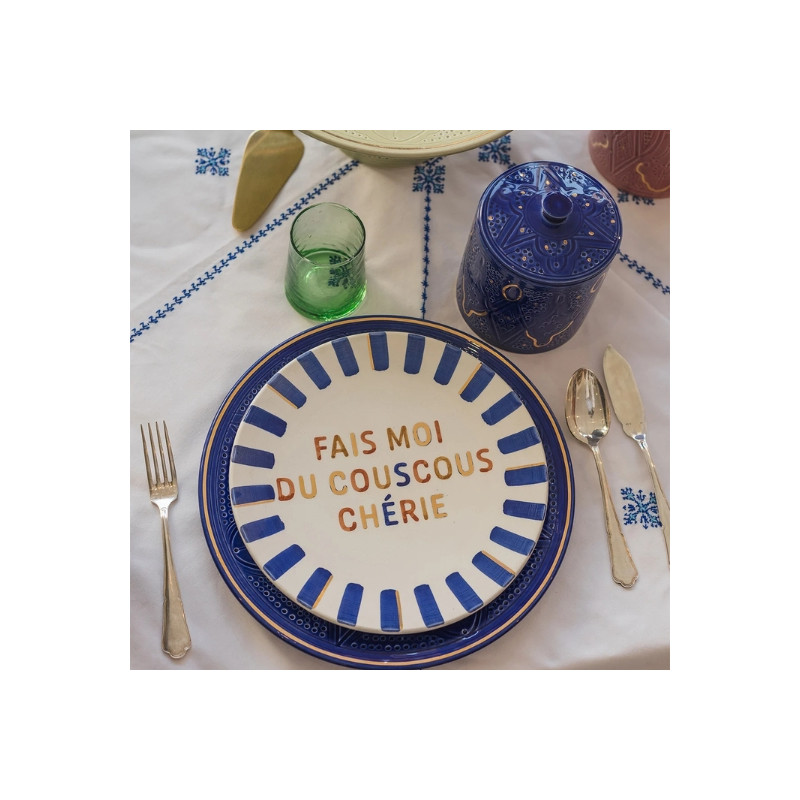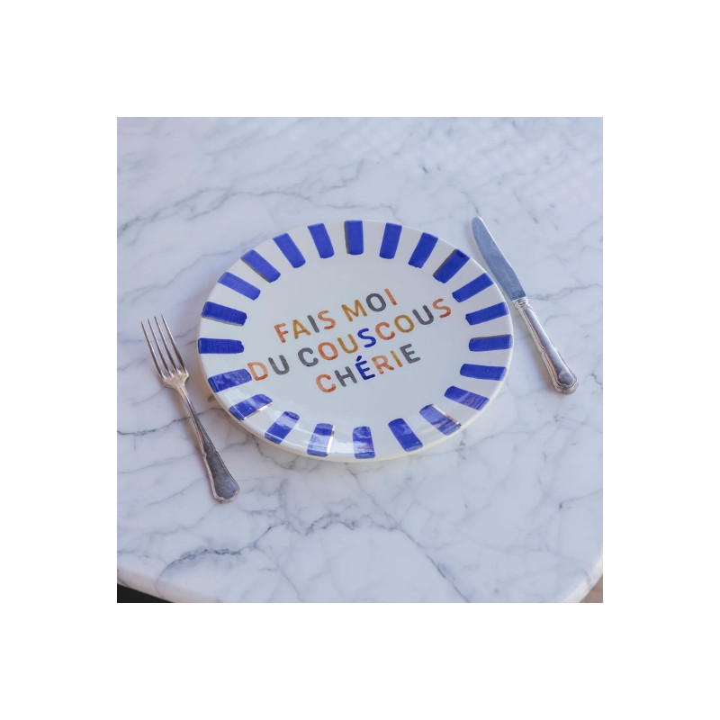 Découvrez Fais-moi du couscous chéri, une assiette qui marie à merveille tradition et modernité. Fabriquée selon un savoir-faire artisanal marocain, elle reprend la silhouette emblématique des assiettes traditionnelles. Un objet du quotidien chargé de charme et d’authenticité.