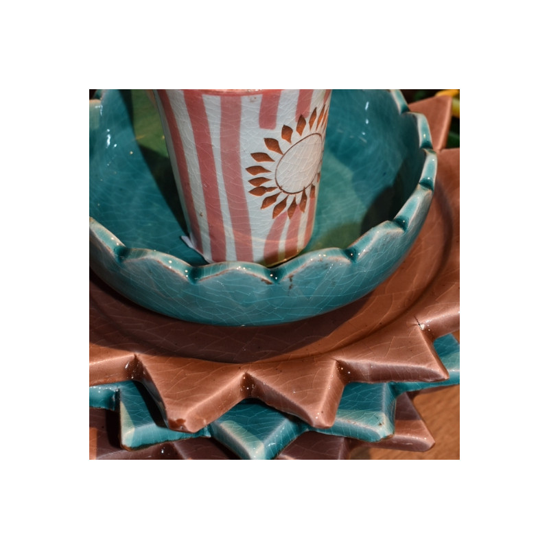 Le bol Soleil turquoise de Soleil Essaouira est une pièce en argile façonnée à la main au Maroc. Frais et lumineux, il apporte une touche artisanale et colorée à votre table.