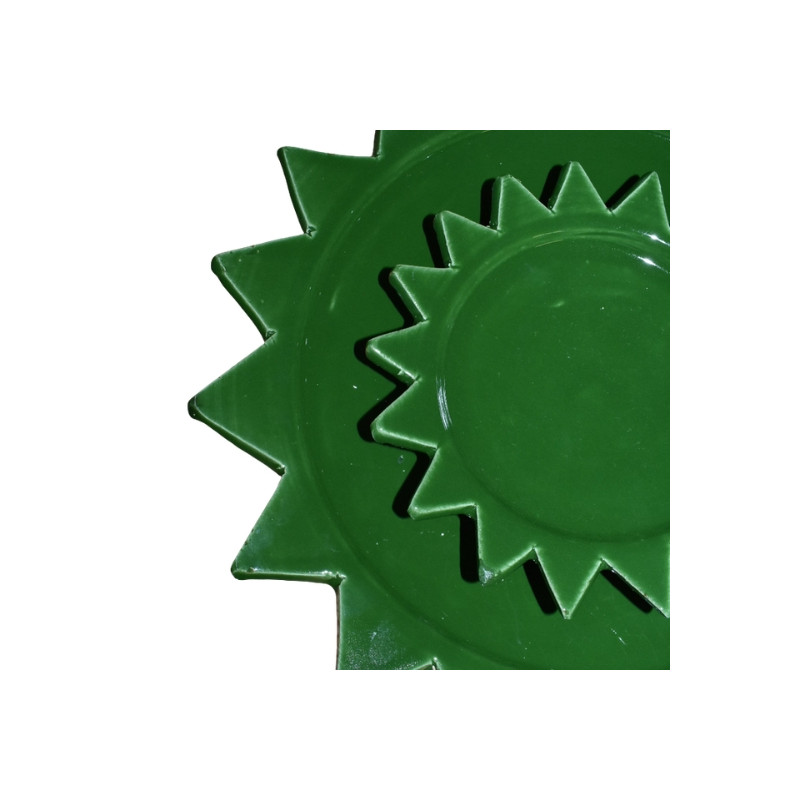 Sa forme rayonnante inspirée du soleil, associée à une teinte verte apaisante, apporte une touche végétale et élégante à votre table. Parfaite pour présenter desserts, fruits ou petites douceurs, elle allie simplicité et caractère dans une pièce à la fois fonctionnelle et décorative. Une création authentique qui sublime le quotidien.