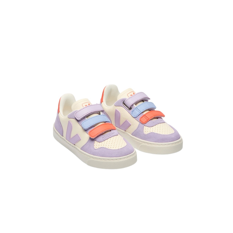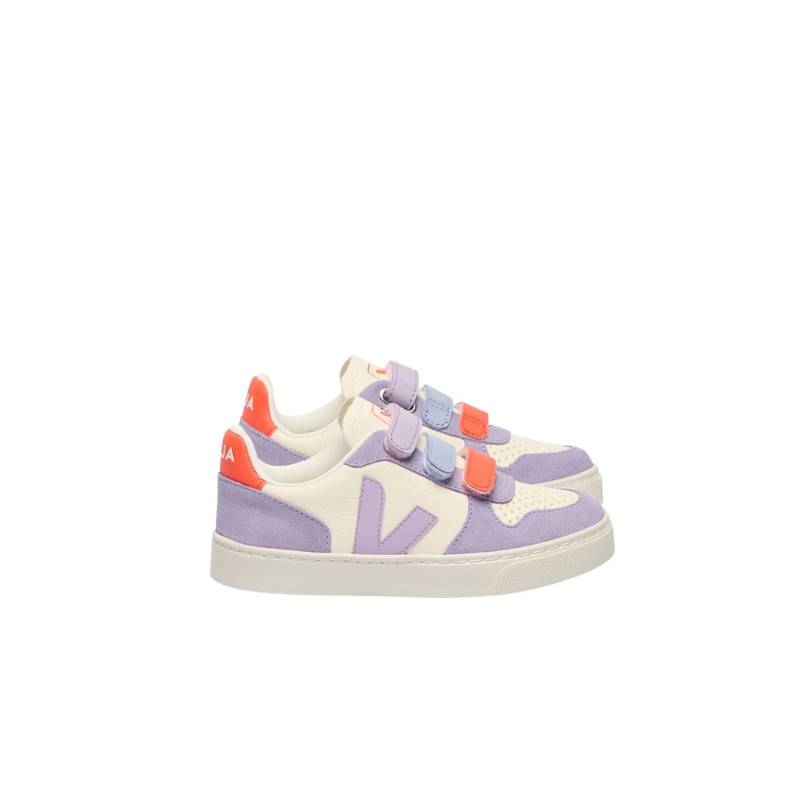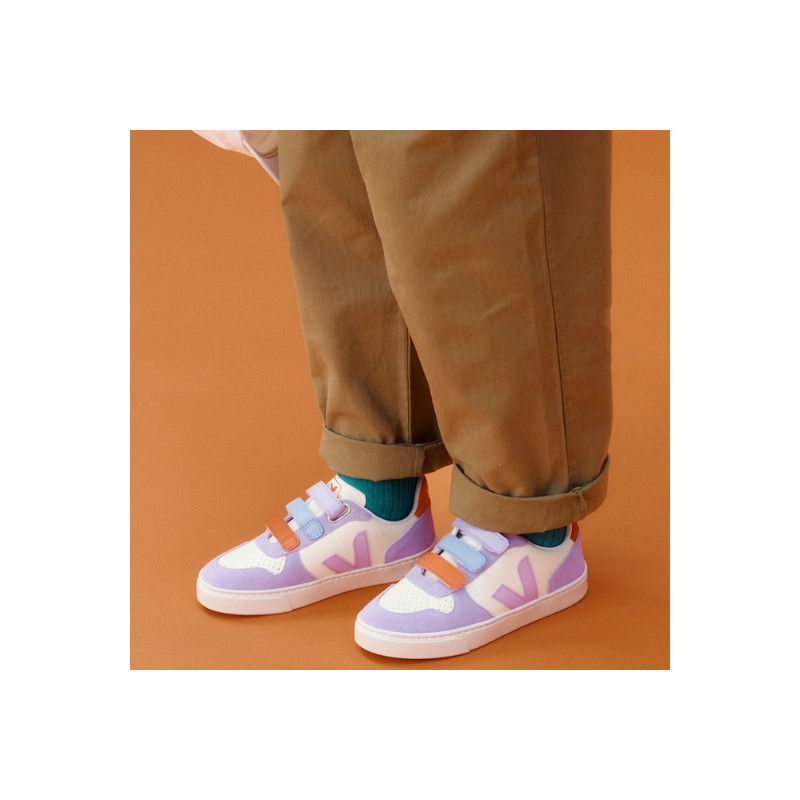 Les baskets V-10 Veja combinent cuir souple et empiècements colorés pour un look fun et confortable. Faciles à enfiler grâce aux scratchs, elles sont idéales pour le quotidien des enfants. Conçues avec une semelle en caoutchouc et des matériaux durables, elles allient style, praticité et engagement éco-responsable.