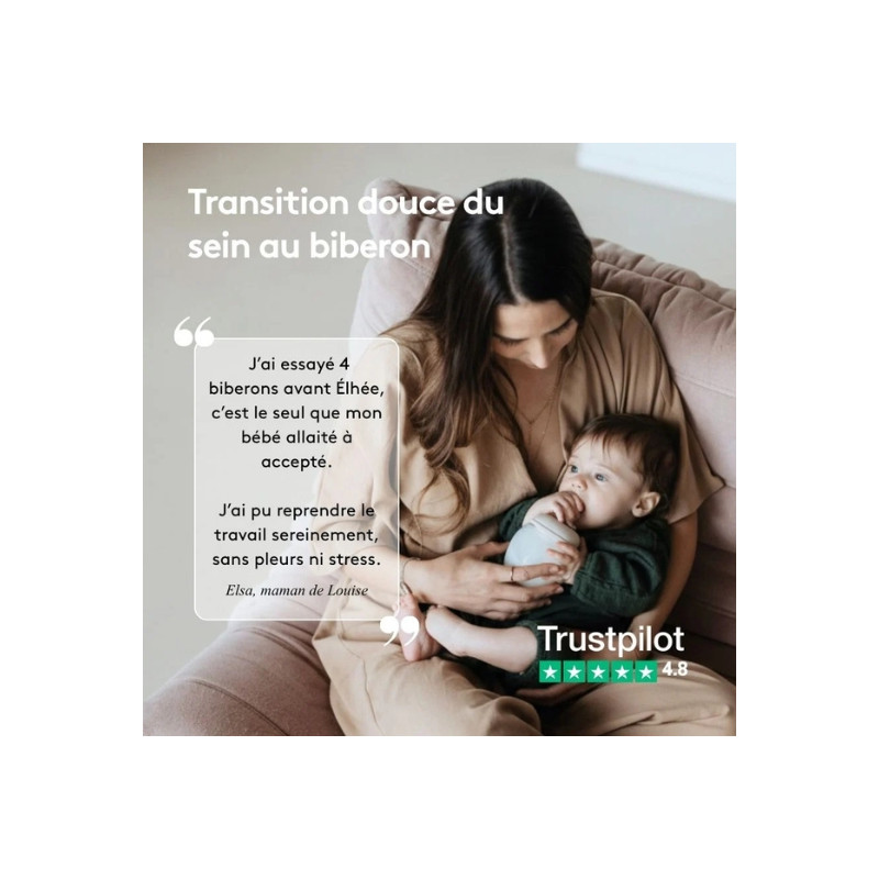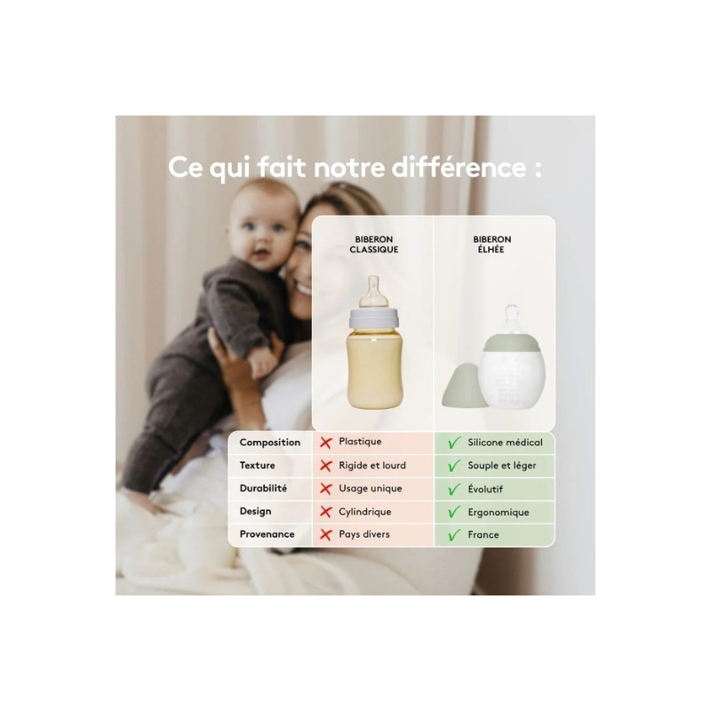 Le biberon ELHÉE 150 ml en silicone médical allie sécurité, confort et design, avec un système anti-colique et une utilisation dès la naissance.