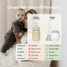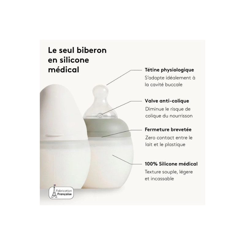Avec son format 150 ml et sa tétine physiologique à débit lent (S), il est parfaitement adapté dès la naissance. Sa conception en silicone médical brevetée garantit une utilisation 100 % saine, sans risque de migration de microparticules de plastique dans le lait.
