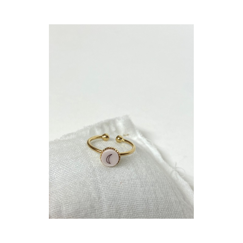 Ici, la bague perle nude plaqué or motif lune de chez Bbuble. La perle est en céramique, les lettres sérigraphiées dans la masse. La bague, plaquée à l'or jaune, rose ou blanc (3 microns), est ajustable!