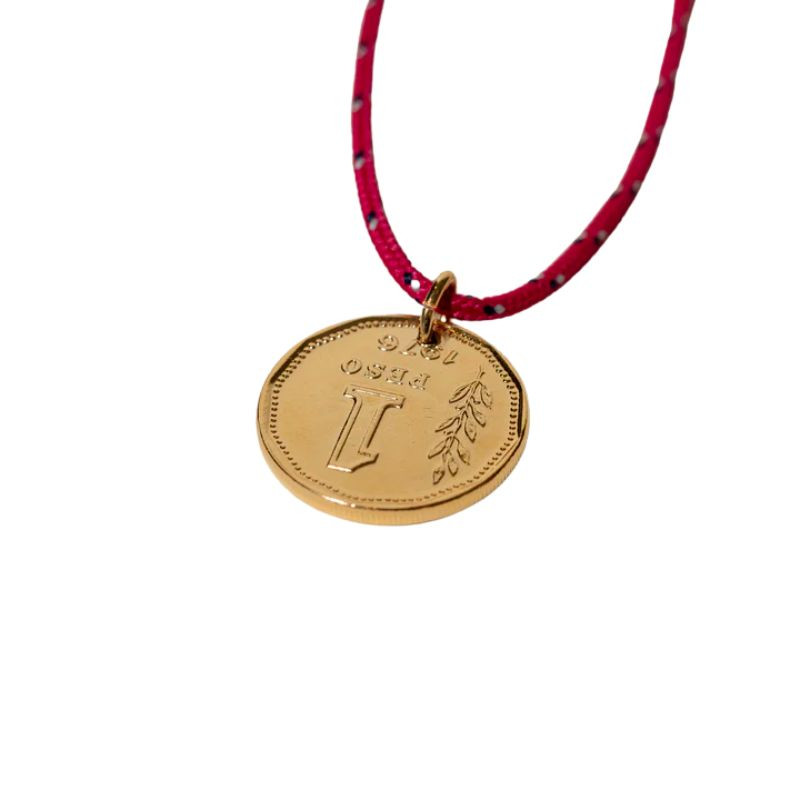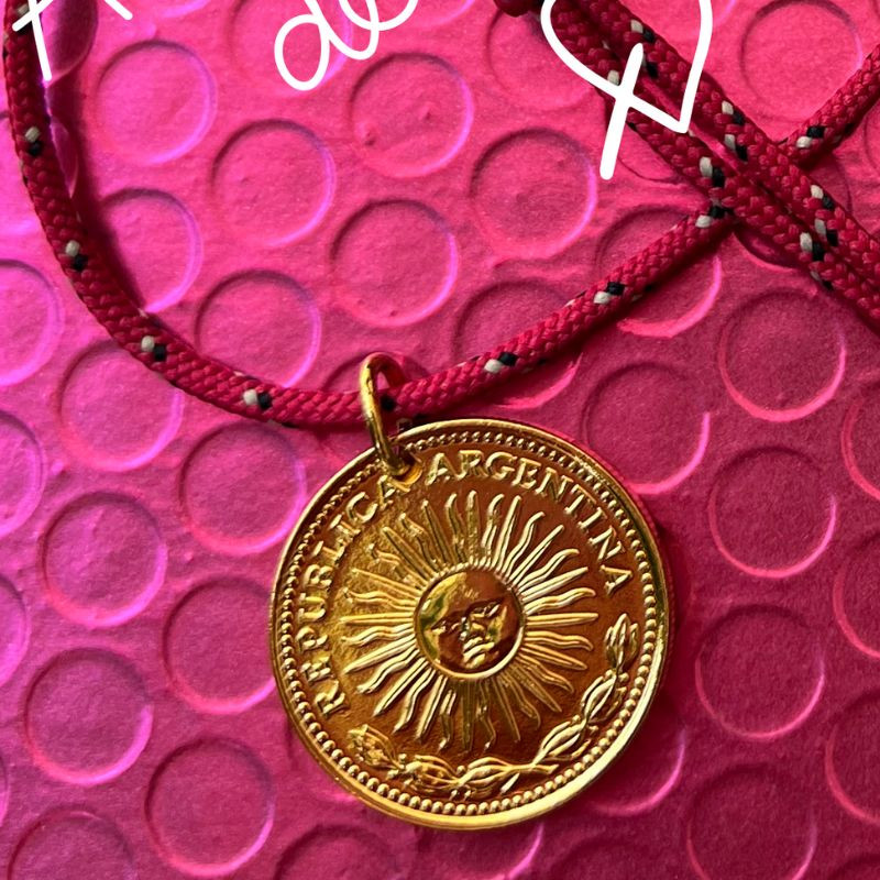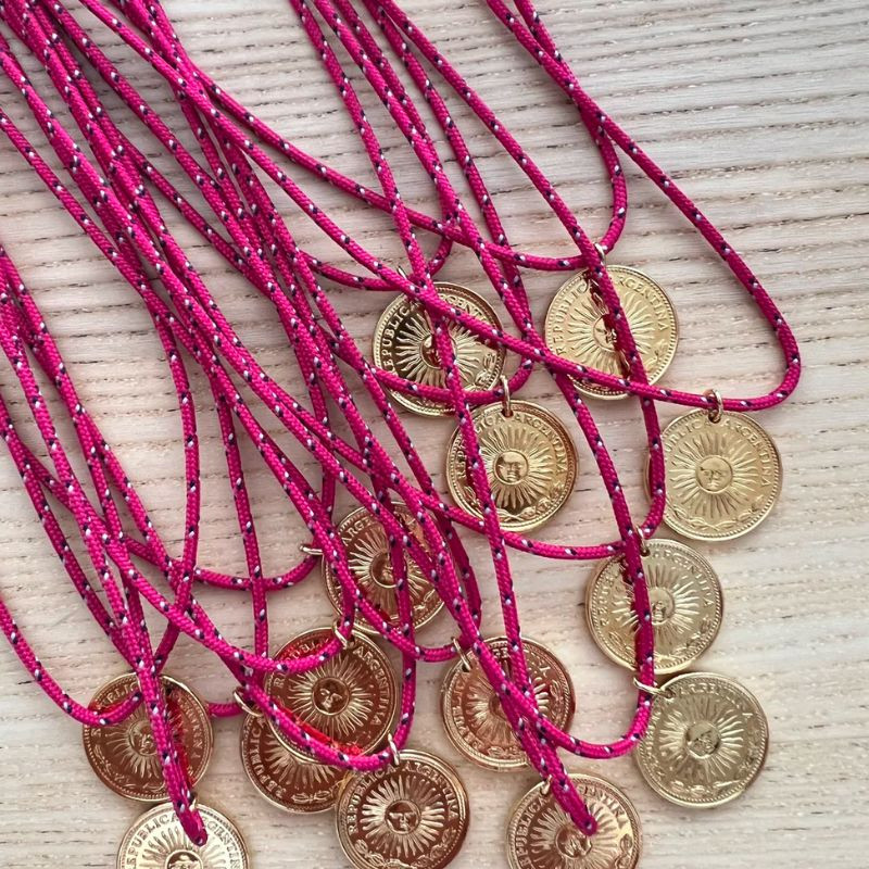 Coup de coeur pour ce Collier "Inti" Cordon Rose de la créatrice Marie Starek. Il est composée d’une pièce de monnaie Argentine en bronze recouverte d'une couche d'or 14 carats et d’un cordon fuchsia réglable par un noeud coulissant - La pièce représente le Dieu du Soleil Inca « Inti ». Les créations MS sont livrées avec un certificat d'authenticité et l'histoire de la pièce. Chaque bijou est unique et fabriqué en France.