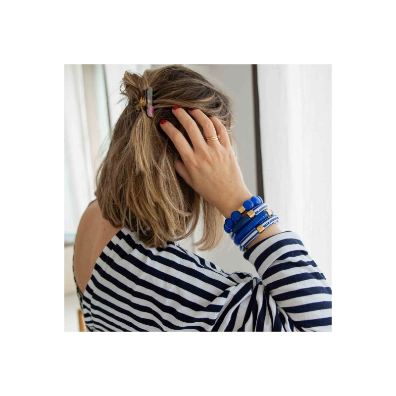 Le bracelet Riviera Cobalt séduit par son bleu intense et lumineux, difficile à capturer à l’écran mais absolument irrésistible en vrai. Composé de 6 perles en résine de qualité et d’une perle dorée gravée PARABAYA, il est monté sur un élastique résistant. À porter seul ou en accumulation, il se marie parfaitement avec du blanc, du denim foncé ou des teintes chaudes pour un contraste moderne et audacieux.