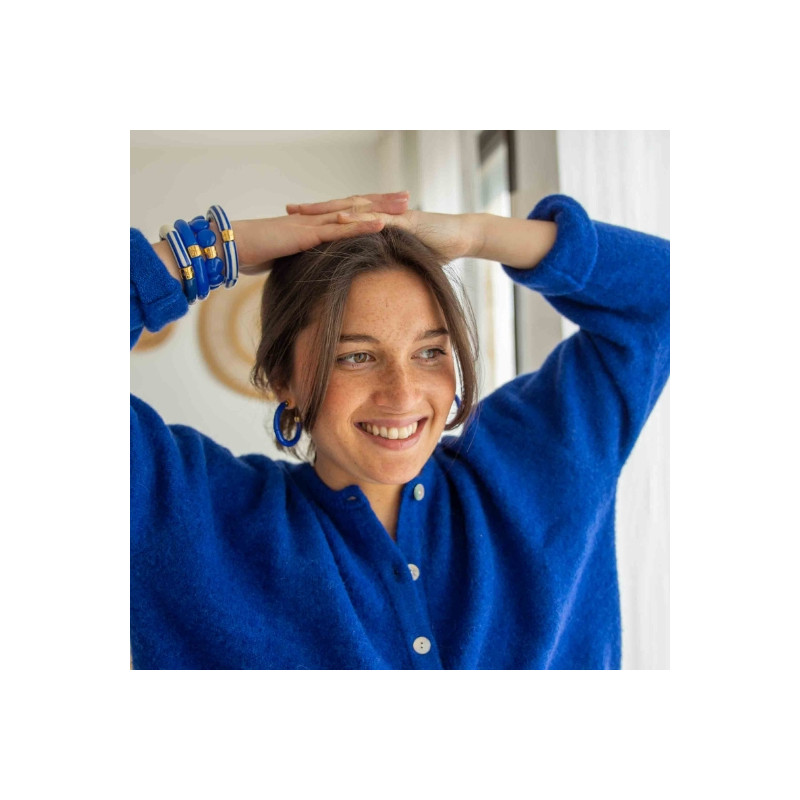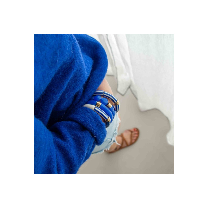 Le bracelet Riviera Cobalt, composé de 6 perles en résine et d’une perle dorée PARABAYA, séduit par son bleu lumineux et intense. Monté sur un élastique résistant, il se porte seul ou en accumulation, avec du blanc, du denim foncé ou des tons chauds.