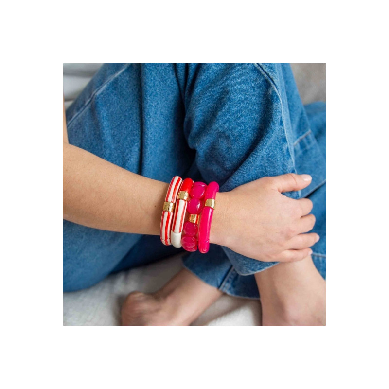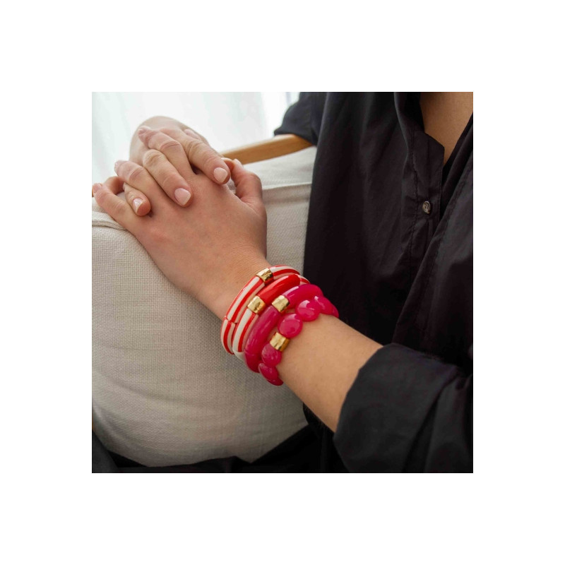 Le bracelet Riviera Magenta, composé de 6 perles en résine et d’une perle dorée PARABAYA, joue sur les contrastes pour un style affirmé. Monté sur un élastique résistant, il se porte seul ou en accumulation pour un look chic et audacieux.