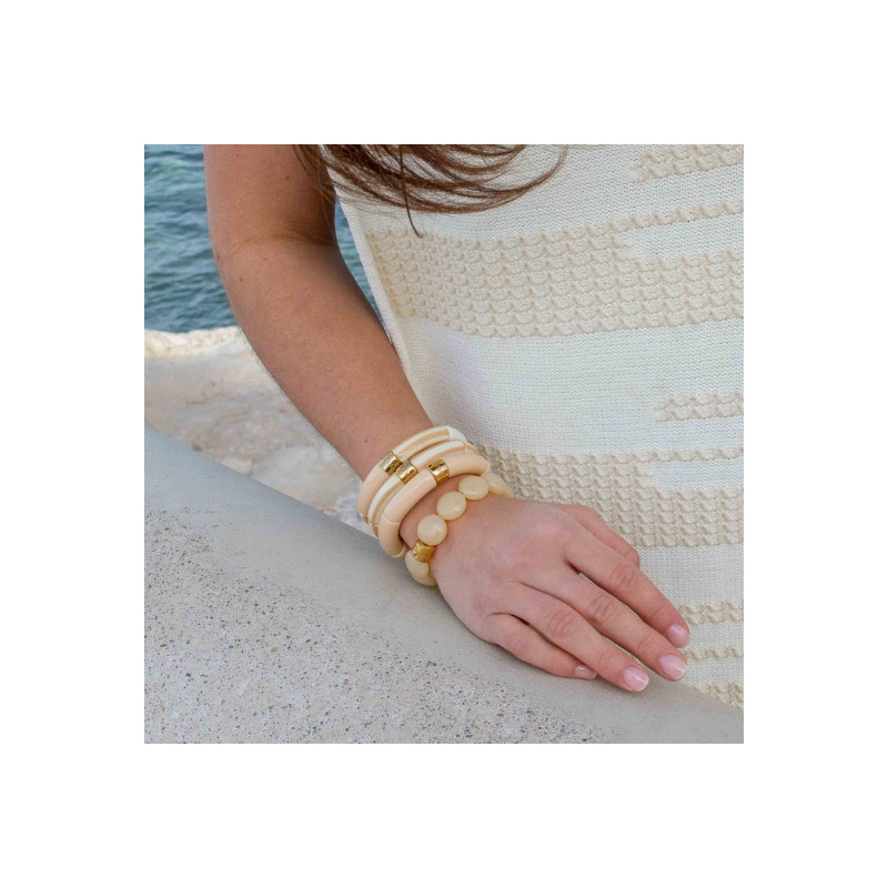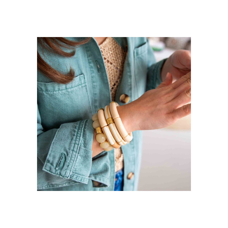 Le bracelet Riviera Beige est composé de 6 perles en acrylique ou résine de qualité et d’une perle dorée gravée PARABAYA. Monté sur un élastique résistant, il se porte seul ou en accumulation, et s’accorde avec toutes les tenues grâce à ses teintes douces et élégantes.