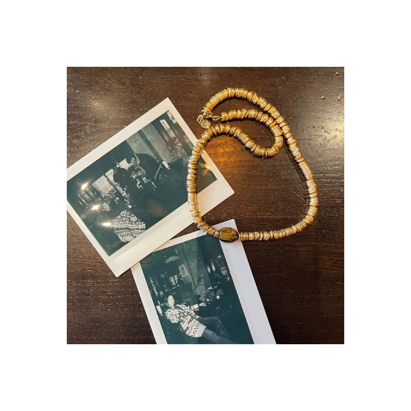 Collier en disques dorés avec scarabée en œil de tigre, monté sur goldfilled 14 carats. Longueur 45 cm. Fait main en France.