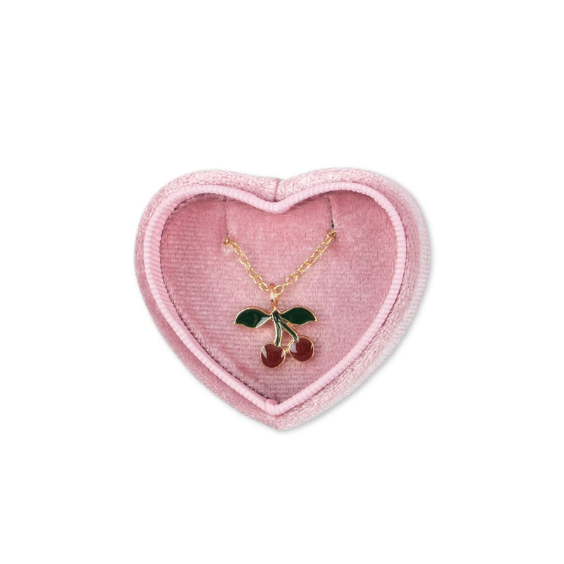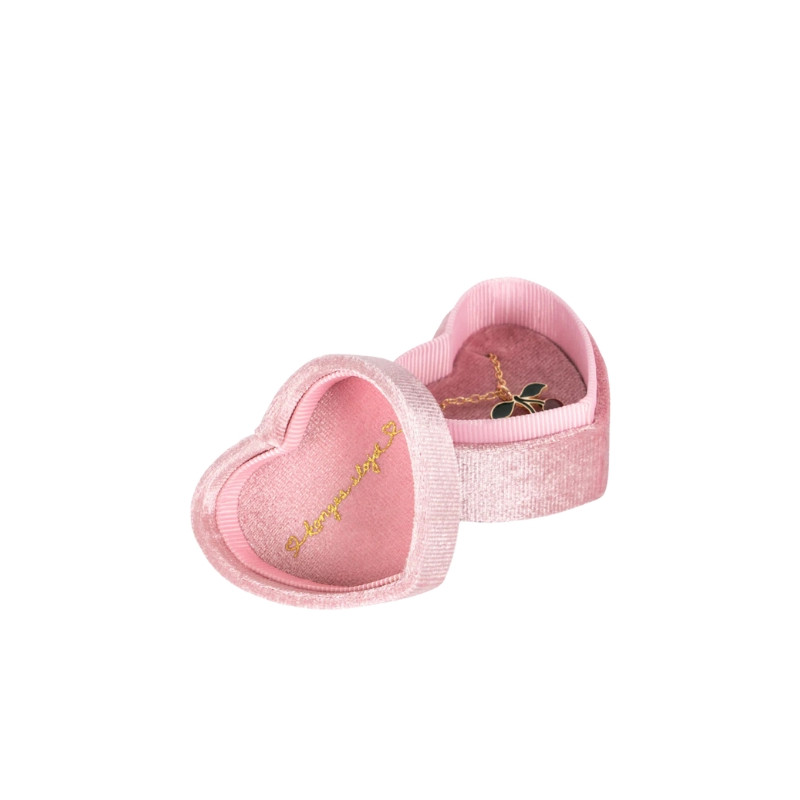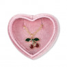 Boîte cœur en velours rose contenant un collier cerise, un cadeau raffiné et plein de tendresse.