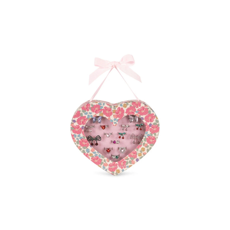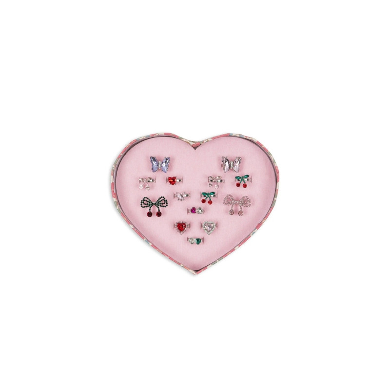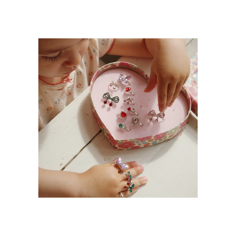 Découvrez ce joli coffret d’anneaux réglables pour enfants, signé Konges Sløjd. Chaque bague est ornée d’un motif différent, pensé pour plaire aux petits rêveurs et ajouter une touche de fantaisie à leurs tenues. Présenté dans une adorable boîte cadeau en forme de cœur, cet ensemble est parfait pour offrir et pour encourager l’imagination lors des jeux d’habillage.