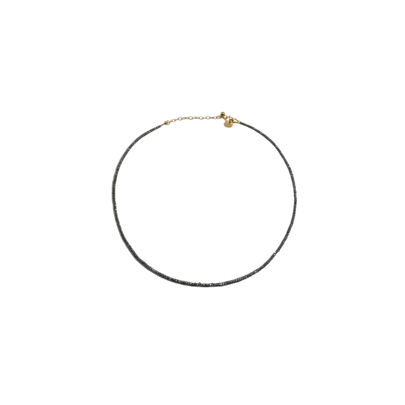 Collier ras de cou en pyrites argentées et goldfilled, longueur ajustable de 33 à 38 cm. Fabriqué à la main dans notre atelier. Finition goldfilled résistante grâce à une épaisse couche d’or 14 carats.