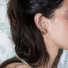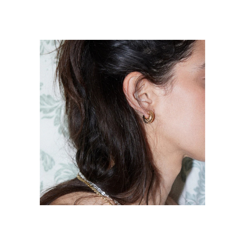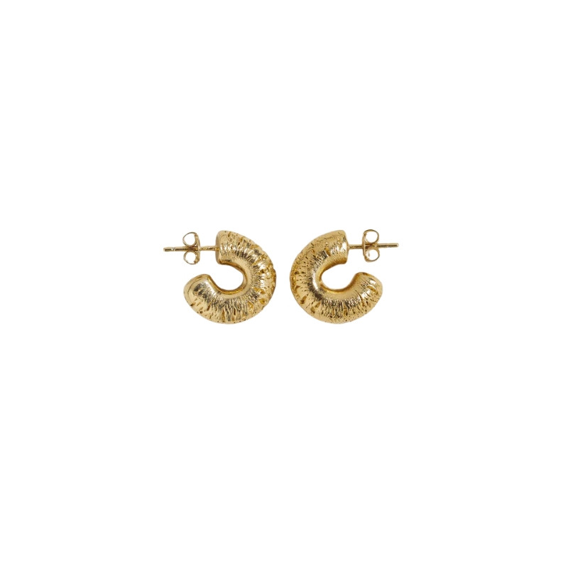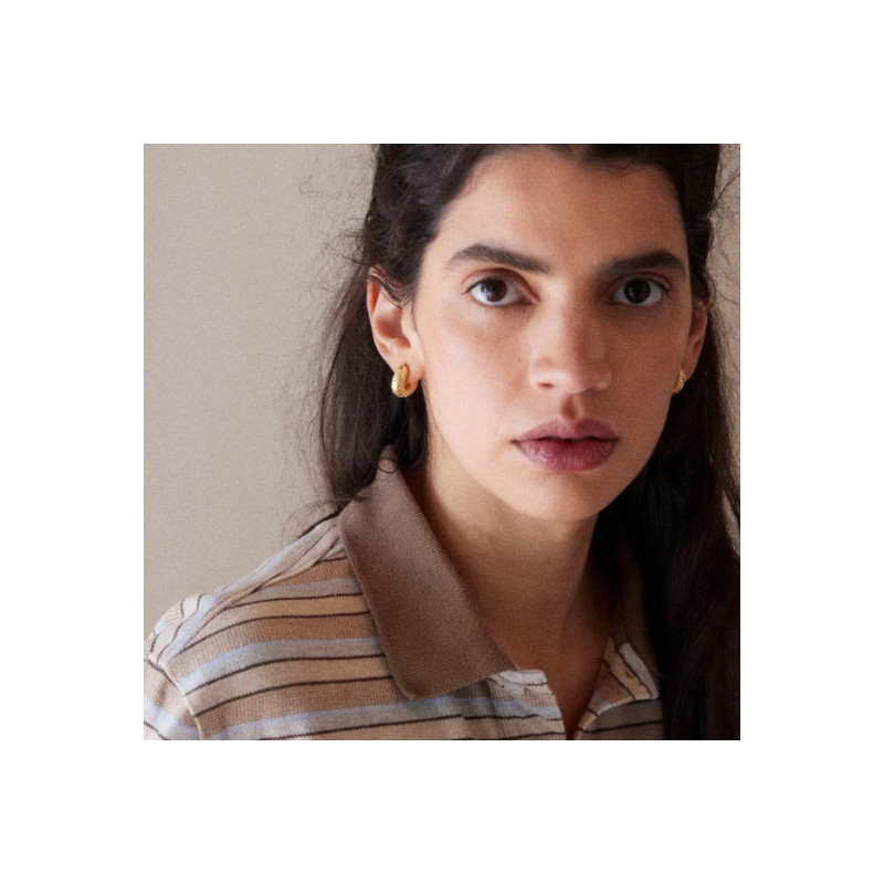 Ces boucles d’oreilles créoles se distinguent par leur texture craquelée et leur volume délicat, offrant un éclat lumineux et un caractère affirmé. Réalisées en étain recyclé doré à l’or fin 24 carats, recyclé et certifié RJC, elles allient esthétique contemporaine et engagement responsable.