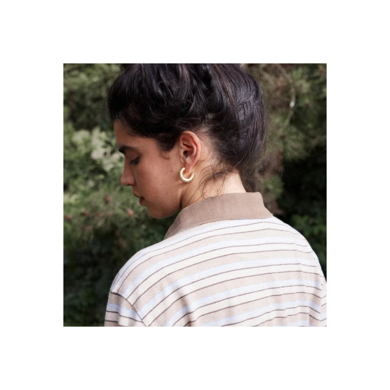Ces créoles dorées au diamètre généreux de 25 mm séduisent par leur texture craquelée et leur éclat lumineux. Réalisées en étain recyclé, doré à l’or fin 24 carats recyclé et certifié RJC, elles conjuguent caractère affirmé et engagement responsable.