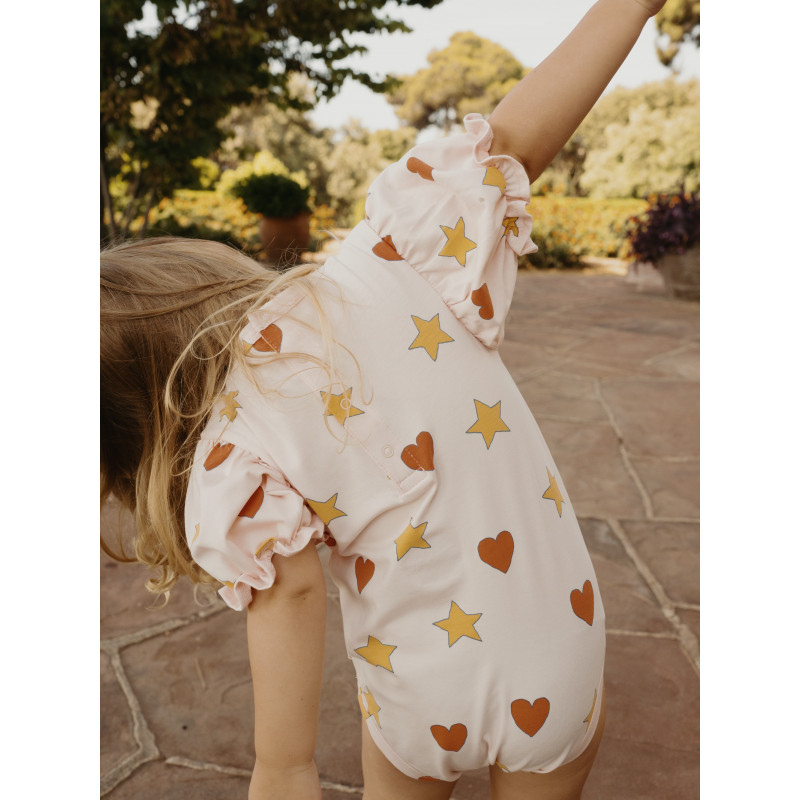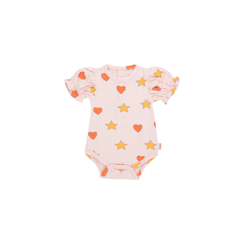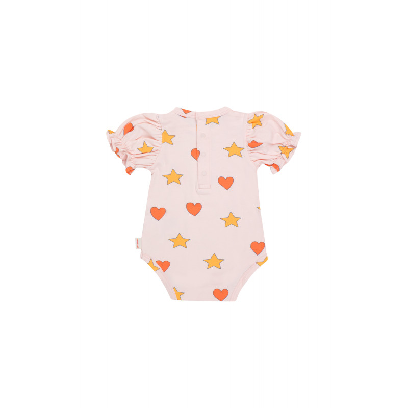 Ce body de couleur rose est confectionné dans un mélange supérieur de coton pima et d'élasthanne. Il dispose de manches bouffantes élastiques, d'une ouverture à boutons-pression au niveau de l'entrejambe et d'un joli imprimé all-over étoiles et coeurs.