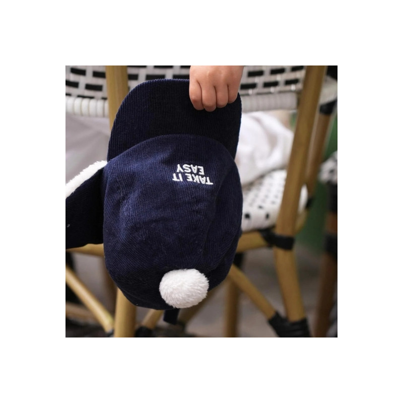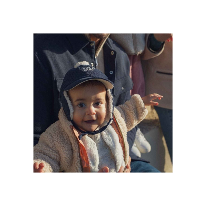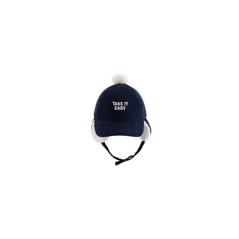 La chapka Take it Easy de Chamaye allie douceur, chaleur et cool attitude. En velours côtelé bleu marine, doublée d’une fausse fourrure moelleuse, elle garde les petites oreilles bien au chaud tout en affichant son message relax préféré. Avec son pompon, sa visière et ses liens à nouer, c’est l’accessoire d’hiver parfait pour affronter le froid avec style.