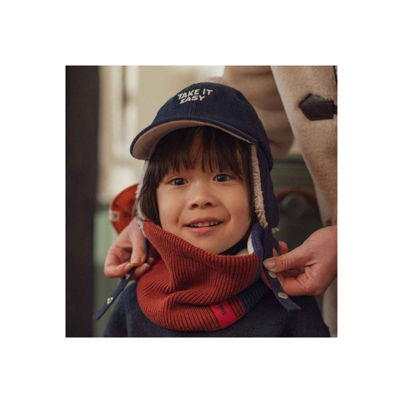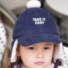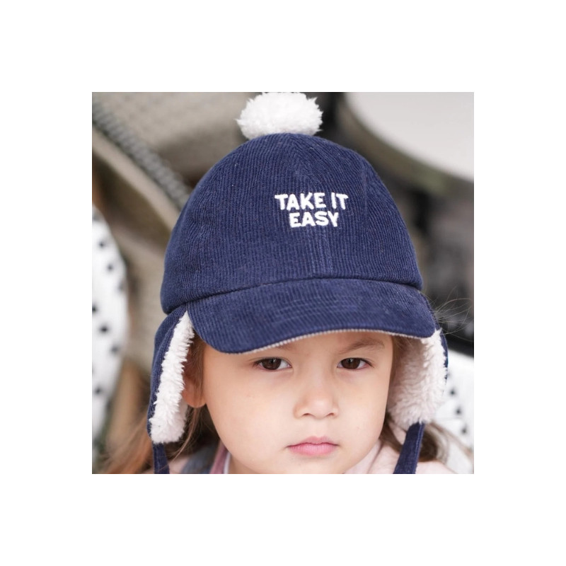 La chapka Take it Easy de Chamaye allie douceur, chaleur et cool attitude. En velours côtelé bleu marine, doublée d’une fausse fourrure moelleuse, elle garde les petites oreilles bien au chaud tout en affichant son message relax préféré. Avec son pompon, sa visière et ses liens à nouer, c’est l’accessoire d’hiver parfait pour affronter le froid avec style.