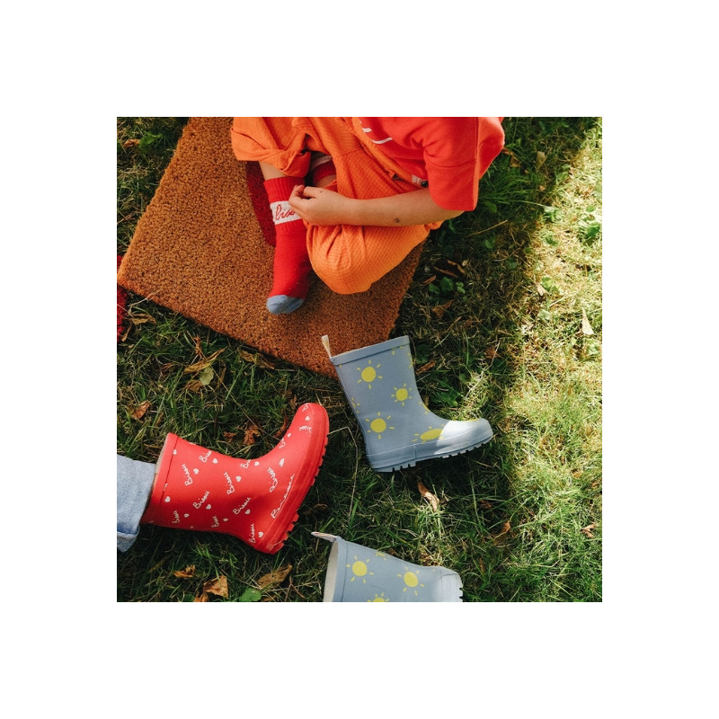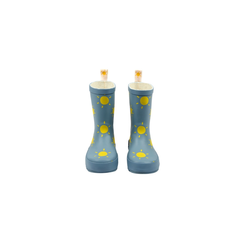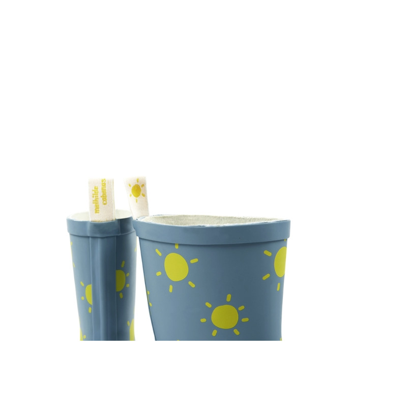 Happy rainy day chez little&tall ! Découvrez les bottes de pluie "soleil" - Mathilde Cabanas. Elles disposent d'une semelle crantée et d'une languette à l'arrière pour les enfiler plus facilement. Ces bottes de pluie bleues disposent d'un joli motif "soleil". Chaussé de ces bottes de pluie, votre enfant pourra sauter, danser, courir dans les flaques et la gadoue.