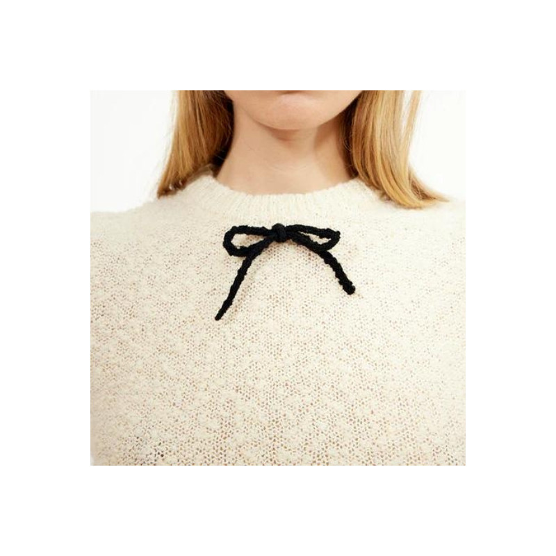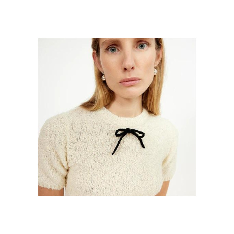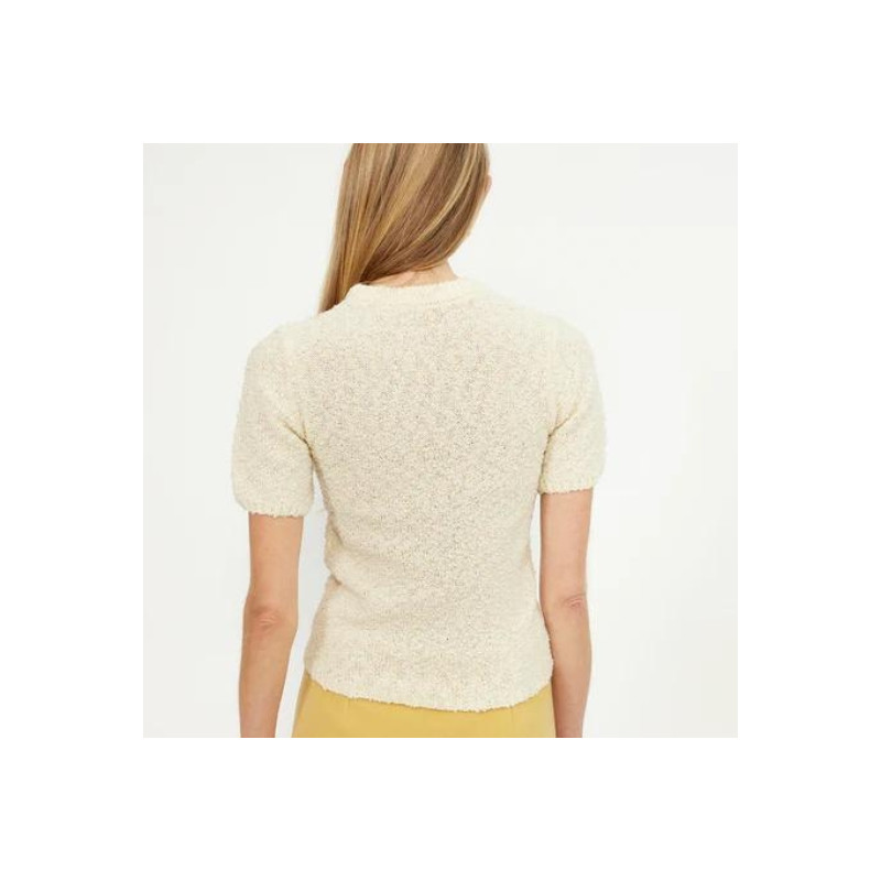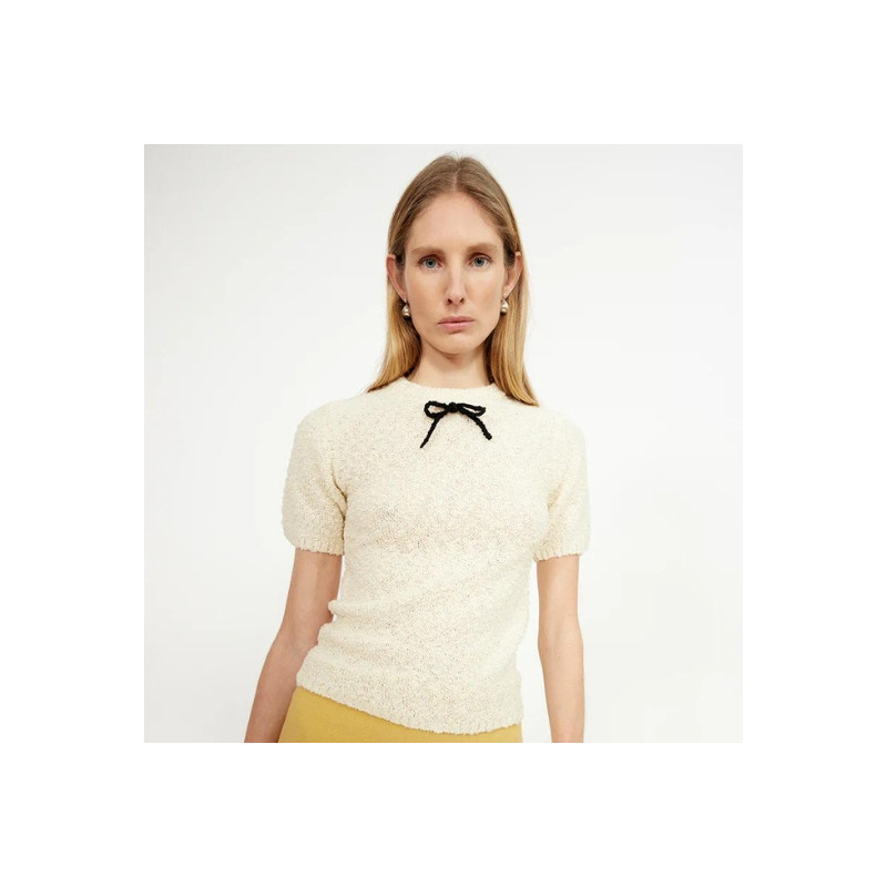 Découvrez le pull manches courtes dans son coloris "écru" de la marque Musier Paris. Ce pull en maille bouclette de printemps, dispose d'un col rond et d'un petit noeud en maille noir sous l'encolure. Il est fabriqué en France et est disponible en plusieurs tailles.