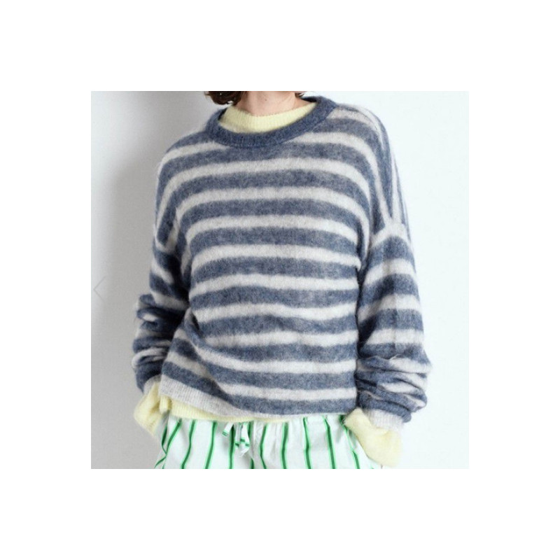 Laissez-vous envelopper par la douceur absolue du pull boule rayé signé American Vintage. Avec son col rond, sa coupe ample et son effet chiné, il vous garantit un style effortless et ultra confort.