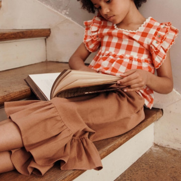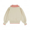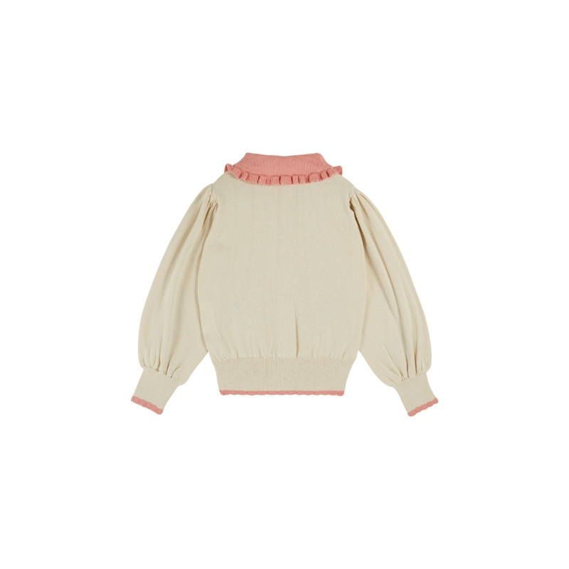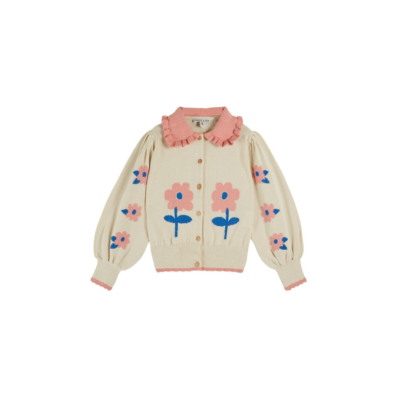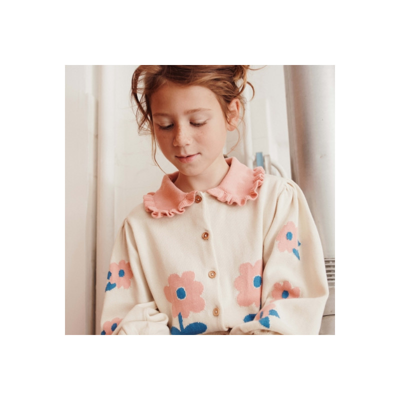 Cardigan enfant beige clair, délicatement orné de grandes fleurs rose poudré au cœur bleu et aux feuilles contrastées. Son col volanté rose apporte une touche rétro pleine de charme, tandis que la fermeture boutonnée sur le devant facilite l’enfilage. Confectionné dans une maille douce et confortable, il réchauffe avec élégance les tenues de mi-saison.