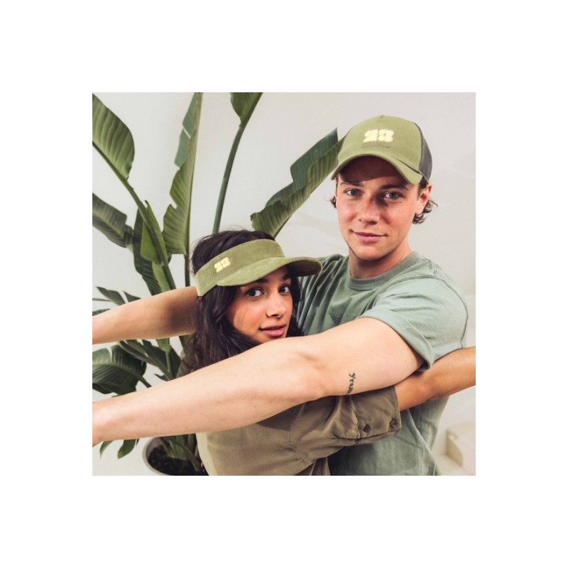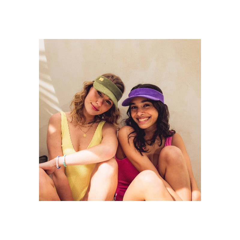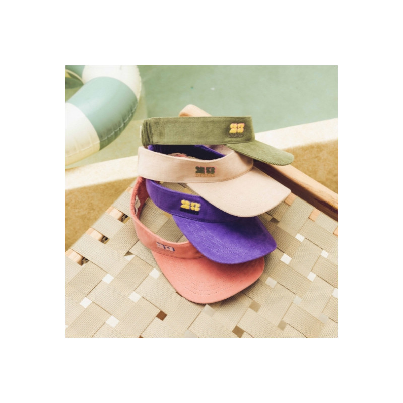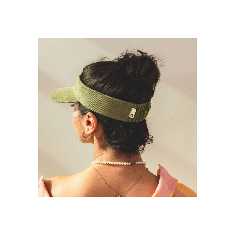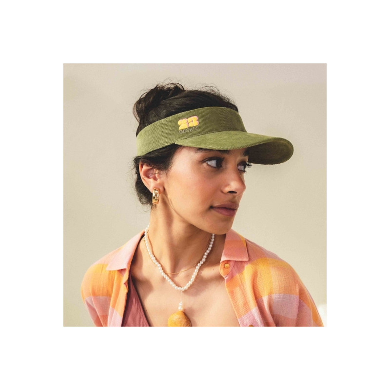 L'accessoire phare des années 80 revient cet été ! Cette visière kaki de la marque 23 DEGRES alliant style et praticité ne vous quittera plus. Elle est confectionnée, teinte et brodée dans un atelier au Portugal. Cette visière en velours milleraies est doté d'une doublure en jersey éponge, d'un avant renforcé pour une bonne tenue, d'une visière incurvée rigide en plastique recyclé, d'un élastique au dos et d'une broderie jaune et rose.