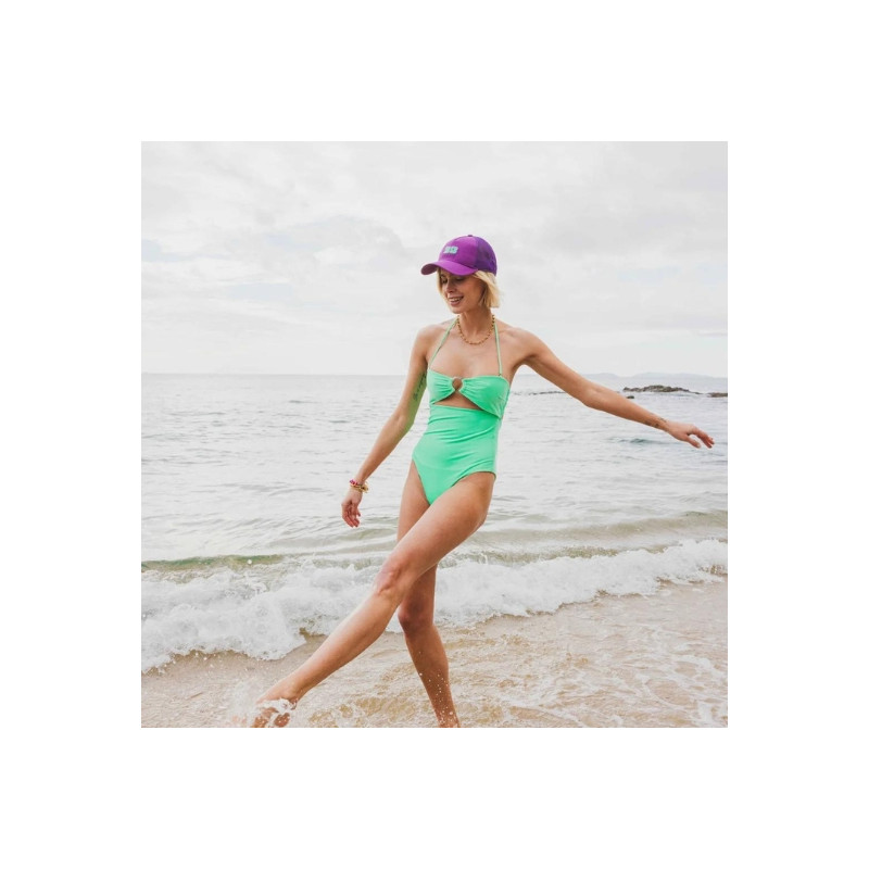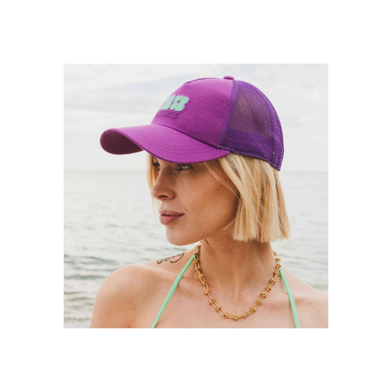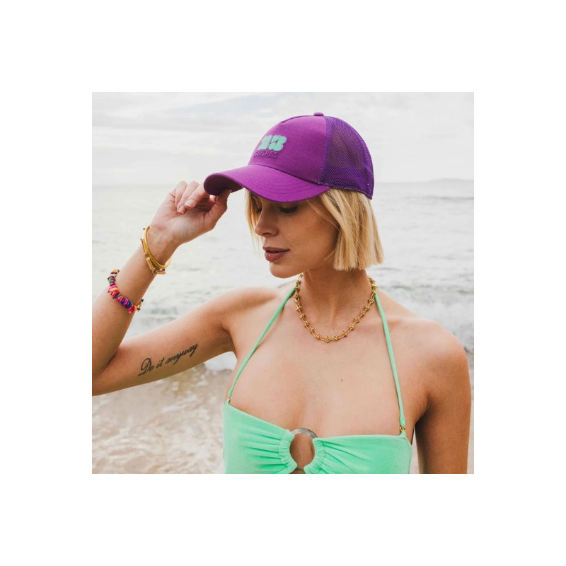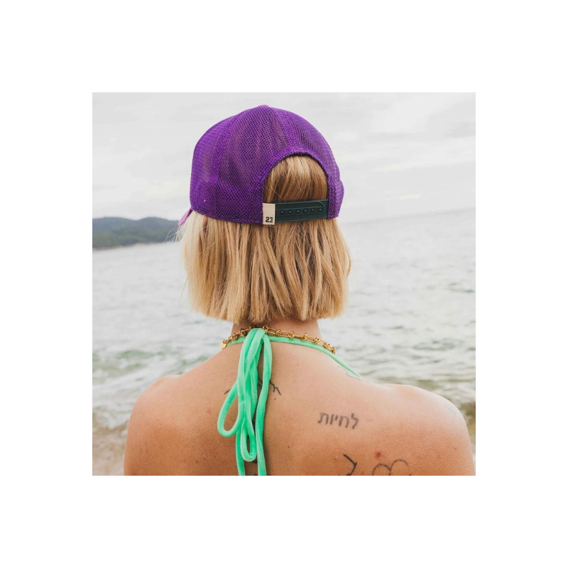 Cette casquette réglable et respirante est confectionnée, teintée et brodée dans un atelier au Portugal. Elle dispose d'une visière incurvée en plastique recyclé, d'une broderie verte et violette sur l'avant, d'une étiquette en coton à l'intérieur et d'un filet sur l'arrière. Une réelle pièce unique et éco-responsable à adopter dans son dressing !