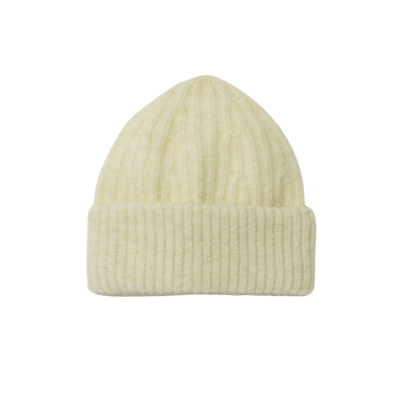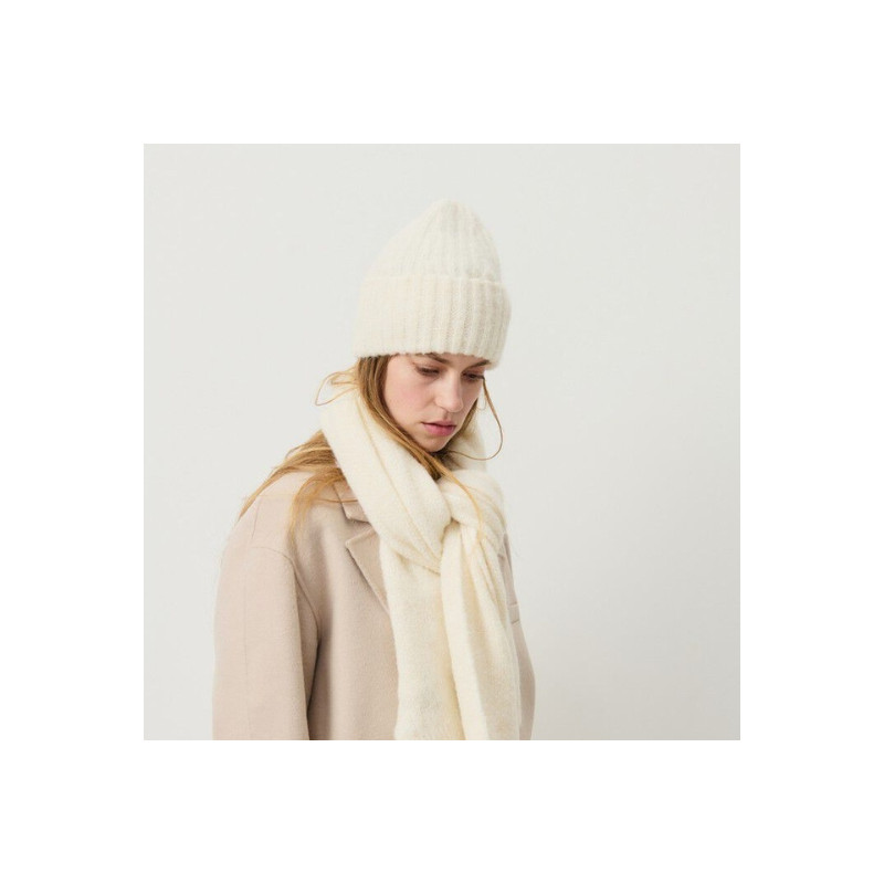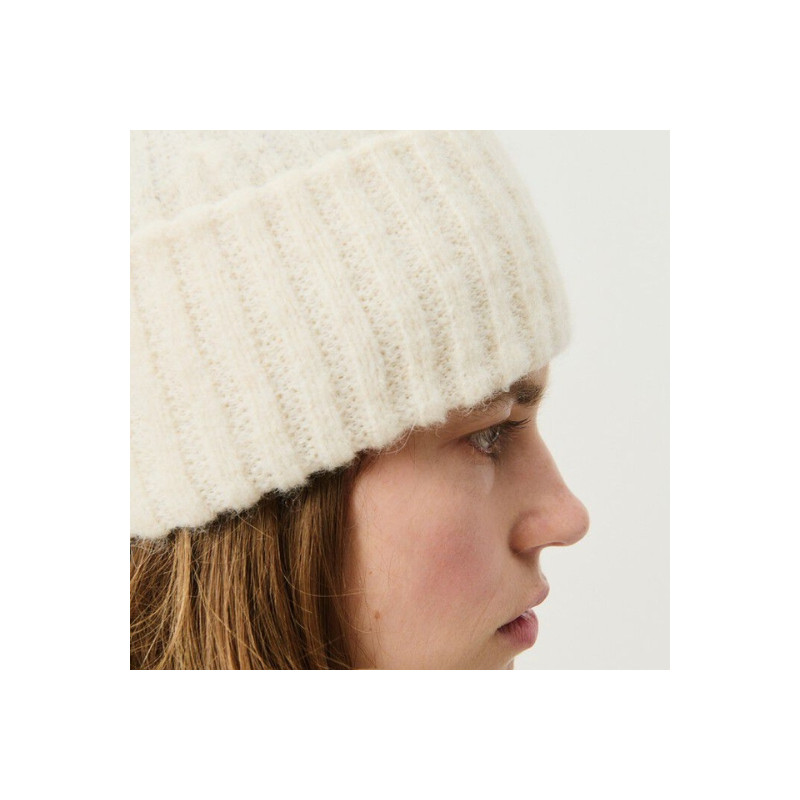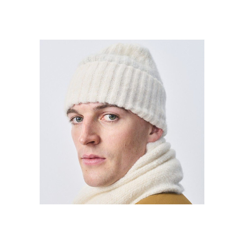 Bonnet écru en maille signé American Vintage. Chaud et confortable, il est composé de fibres mélangées avec de l’alpaga. Lavage à la main.