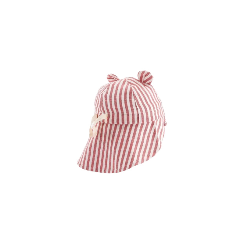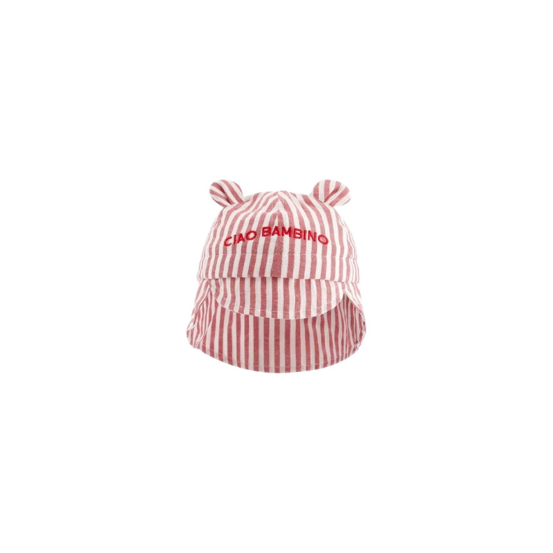 Le chapeau Ciao Bambino bébé de chez Chamaye séduit par ses rayures rouges, sa broderie et ses petites oreilles. Un accessoire craquant et protecteur pour l’été.