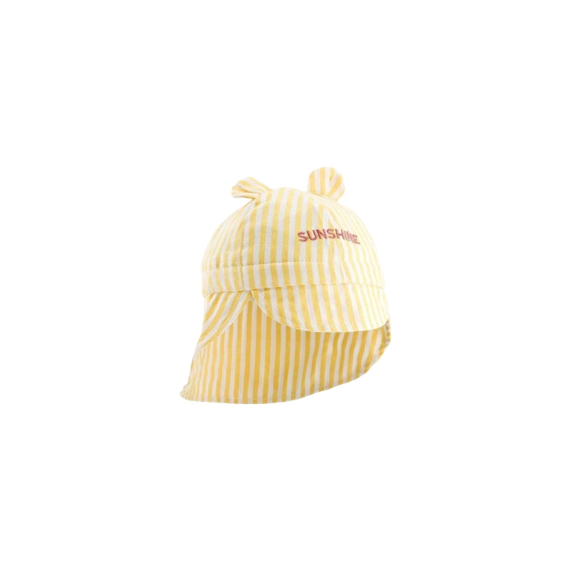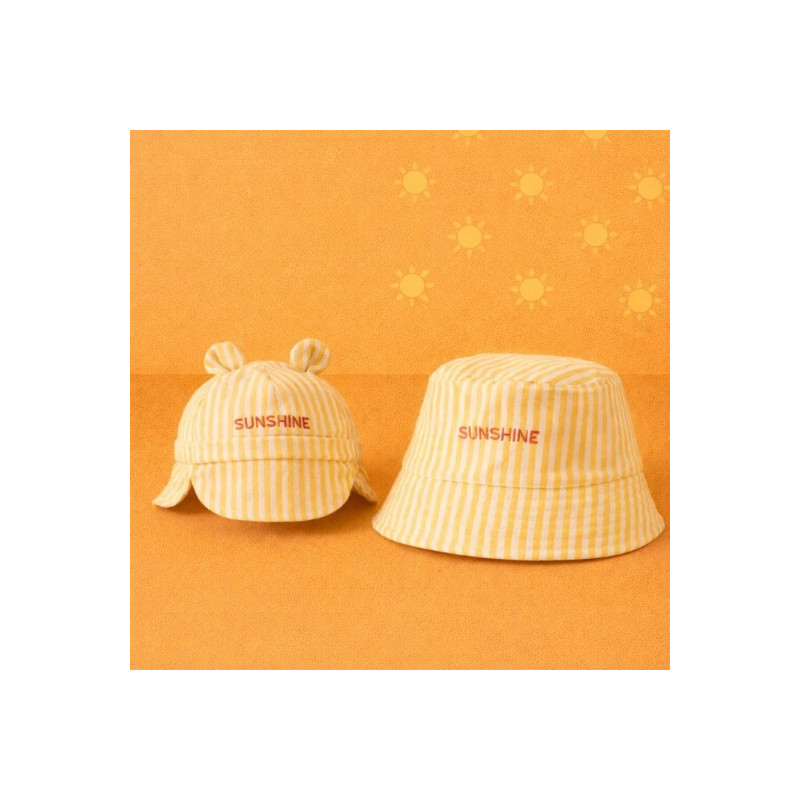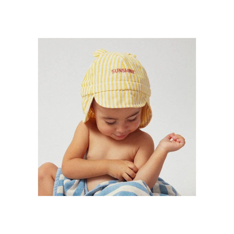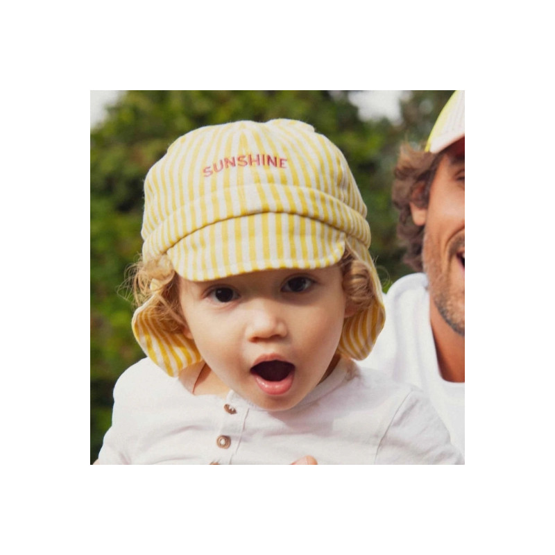 Le chapeau Sunshine bébé de chez Chamaye est une adorable protection solaire pensée pour les tout-petits. Avec ses rayures jaunes lumineuses et sa broderie “SUNSHINE”, il apporte une touche douce et ensoleillée aux premières sorties de bébé.