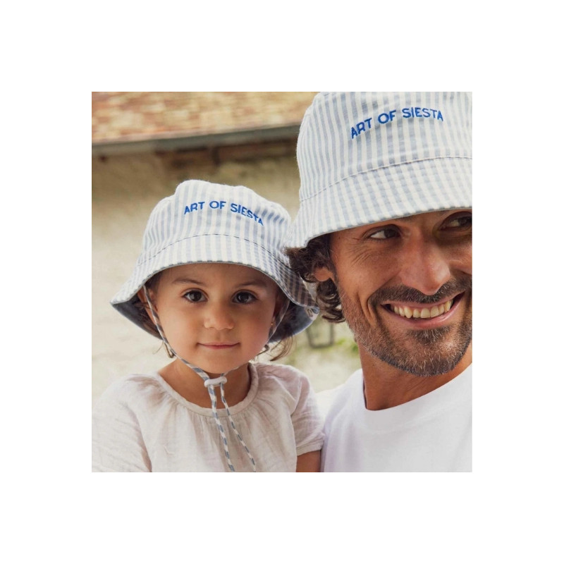Le bob Art Of Siesta de chez Chamaye, réversible et à rayures bleues, est un essentiel estival. Pratique et confortable, il protège du soleil avec style.