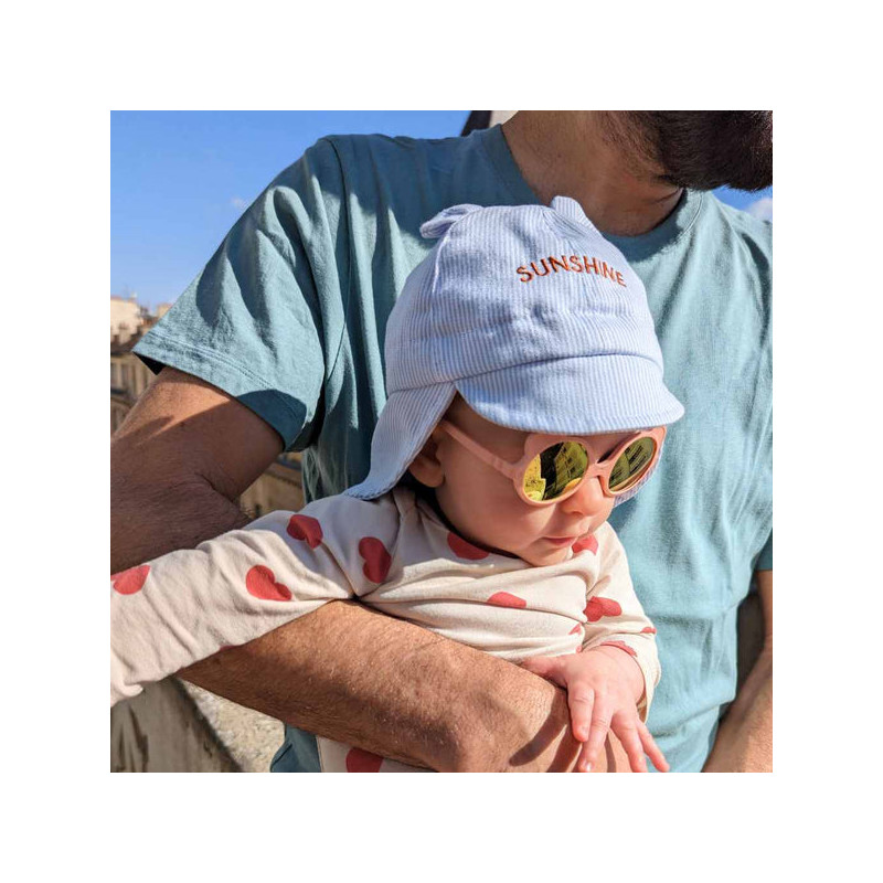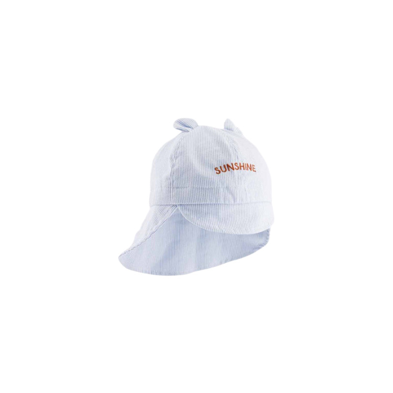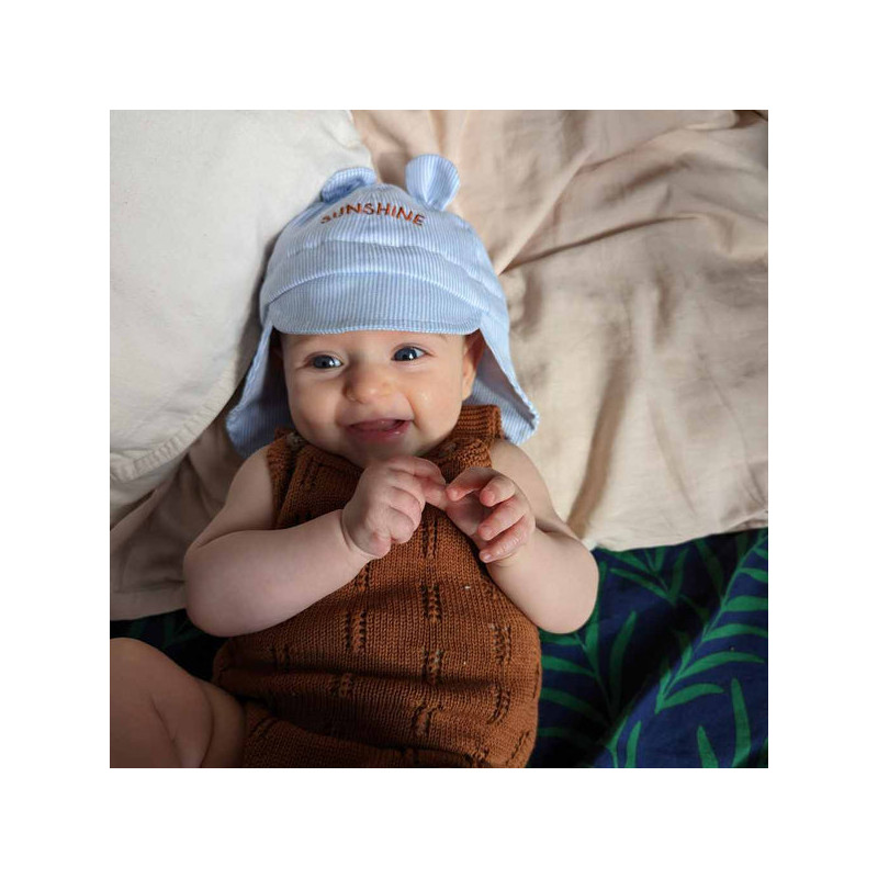 Protection UV assurée pour les beaux jours avec le chapeau Sunshine pour bébé de la marque Chamaye. Rayé bleu et blanc, il est idéal pour protéger le cuir chevelu et le cou sensible des bébés & tout-petits grâce à sa protection supplémentaire à l'arrière.
