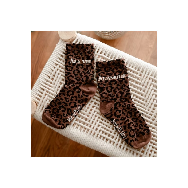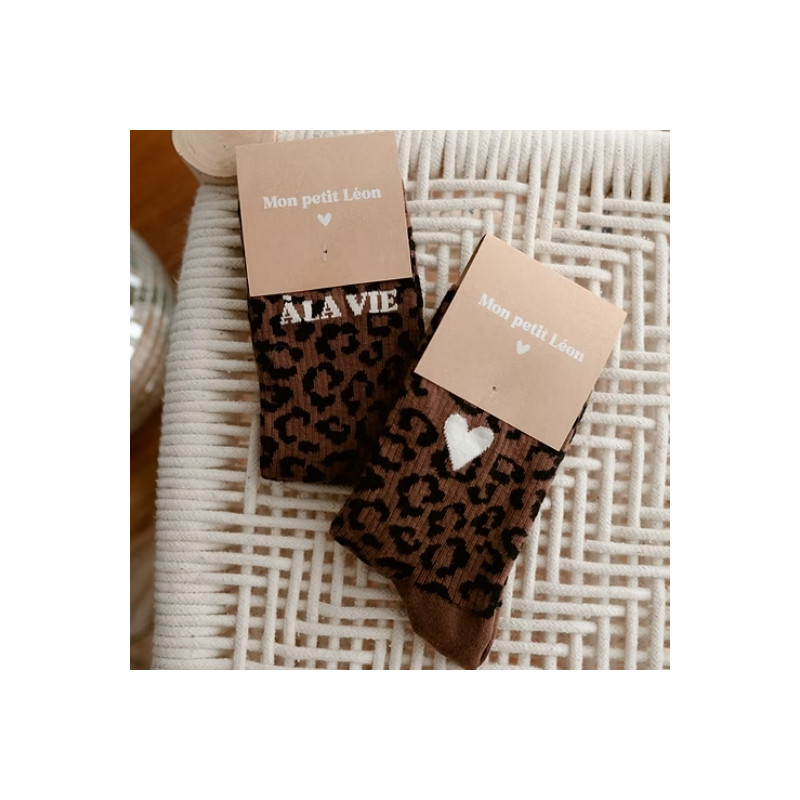 Chaussettes léopard en édition limitée signées Mon petit Léon. Imprimé marron foncé avec petite note "A la vie à l'Amour" contrasté. Douces, stylées et parfaites à offrir.