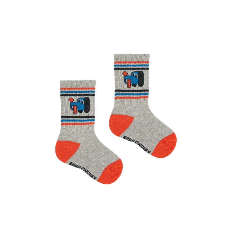 Chaussettes bébé BOBO CHOSES en coton biologique gris chiné, avec motifs ludiques et détails colorés. Douces, extensibles et fabriquées en Espagne.