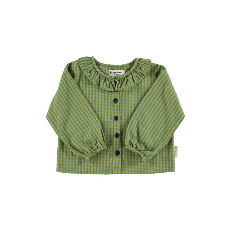 Blouse en flanelle de coton bio à col rond volanté, manches longues avec poignets élastiqués et boutons sur le devant. Motif à carreaux vert, douce et confortable pour l'automne.