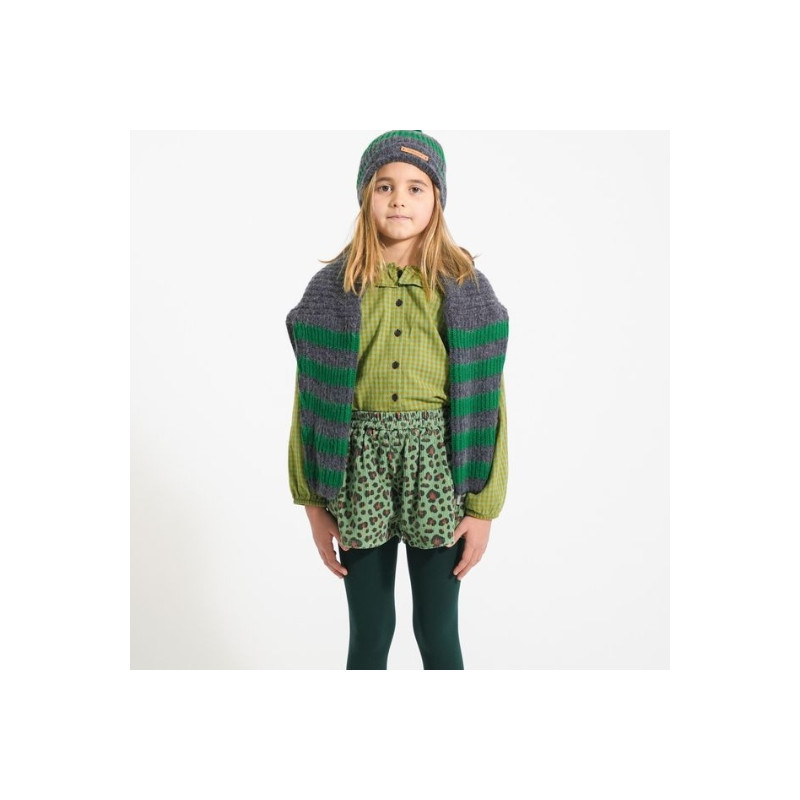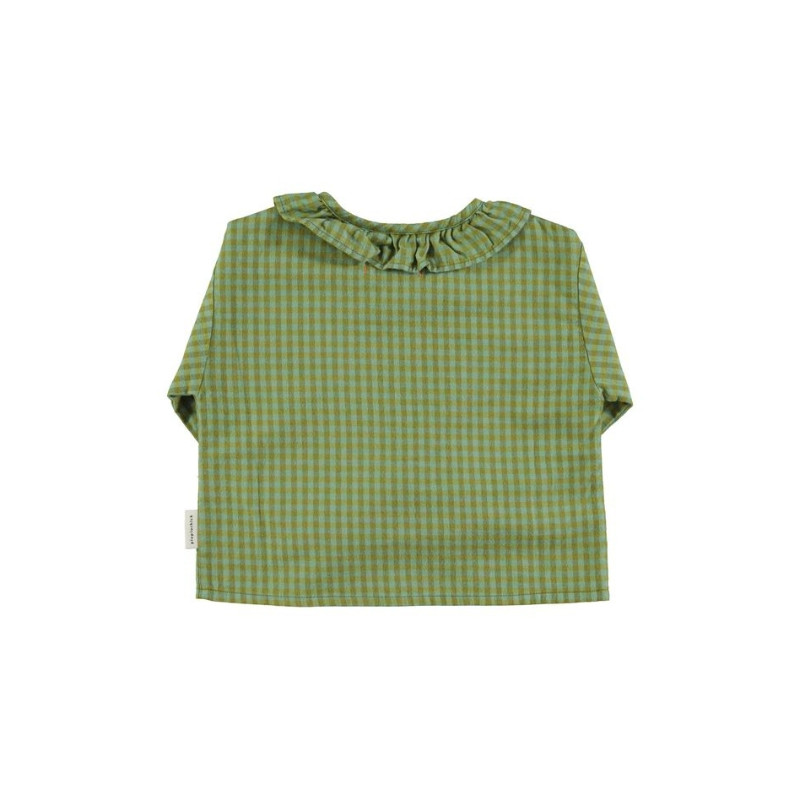 Confectionnée en 100 % coton biologique, cette blouse de la collection AW25 de Piupiuchick séduit par son charme intemporel. Son col rond délicatement volanté, ses poignets élastiqués et sa fermeture boutonnée à l’avant en font une pièce à la fois élégante et confortable. Son motif à carreaux vert en flanelle offre douceur et chaleur pour la saison, idéale pour les journées fraîches.