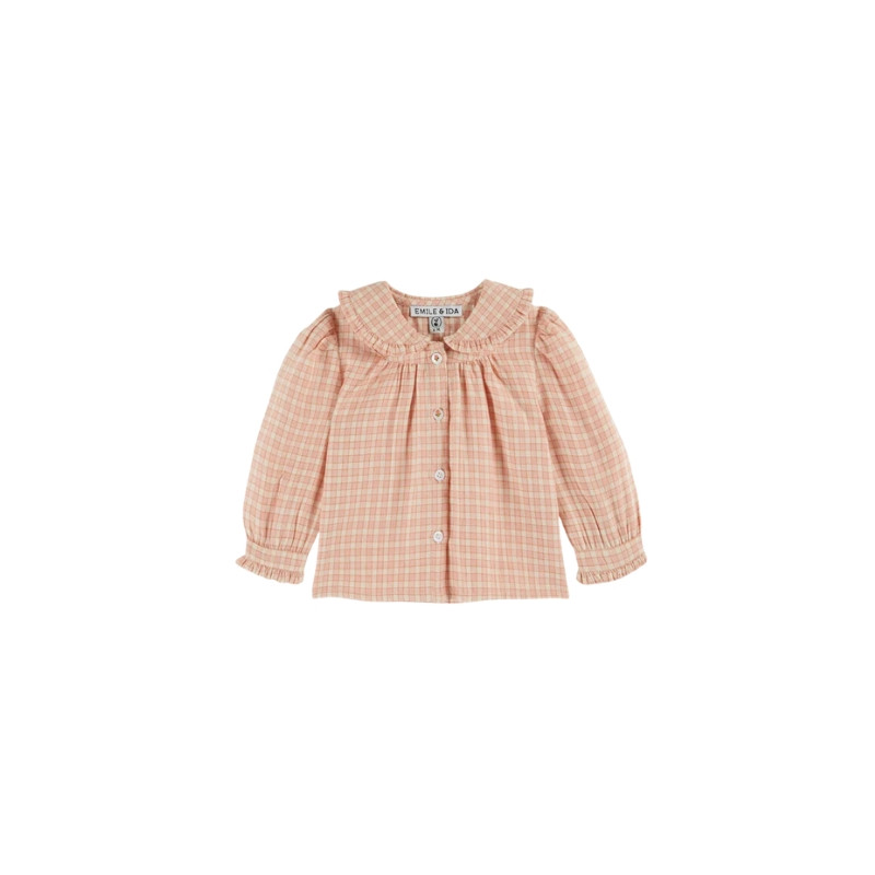 Blouse écolier col nœud de chez Émile et Ida. Une coupe confortable en coton à carreaux, un col volanté orné d’un petit nœud et une patte de boutonnage sur le devant pour un style rétro plein de douceur.