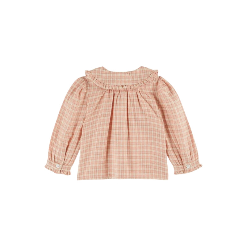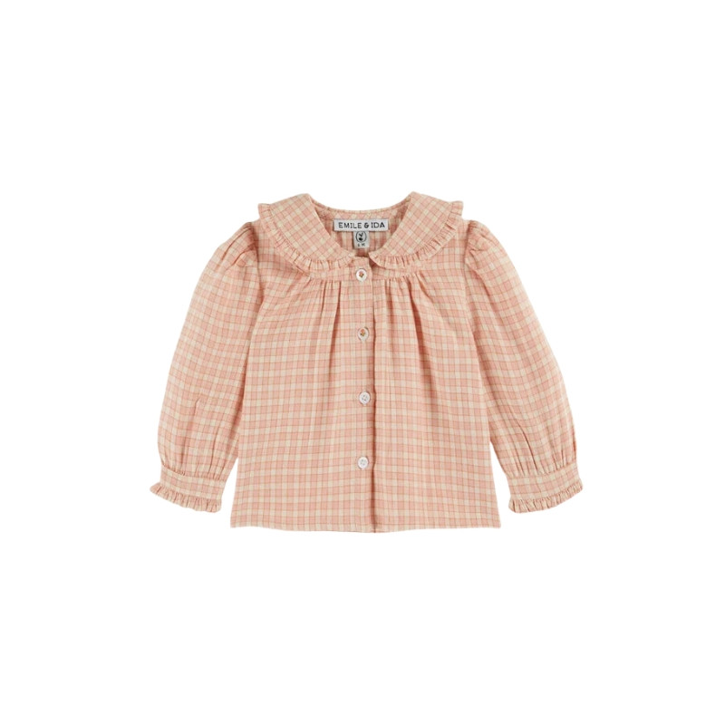Blouse écolier col nœud de chez Émile et Ida. Une coupe confortable en coton à carreaux, un col volanté orné d’un petit nœud et une patte de boutonnage sur le devant pour un style rétro plein de douceur.
