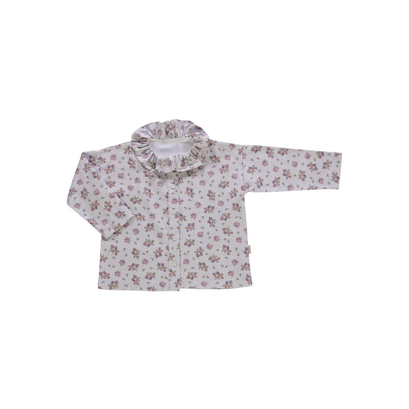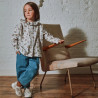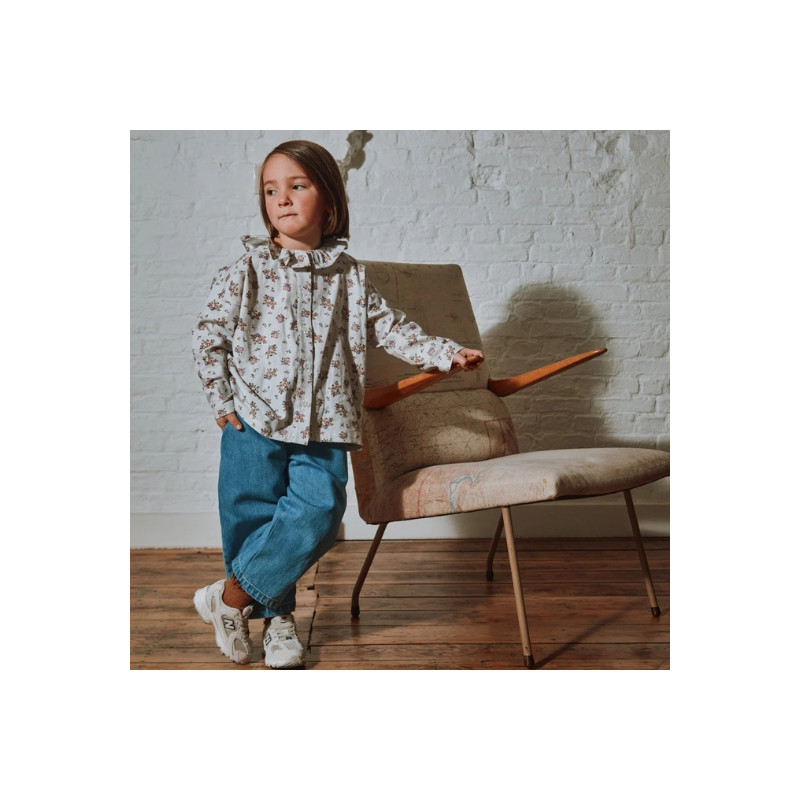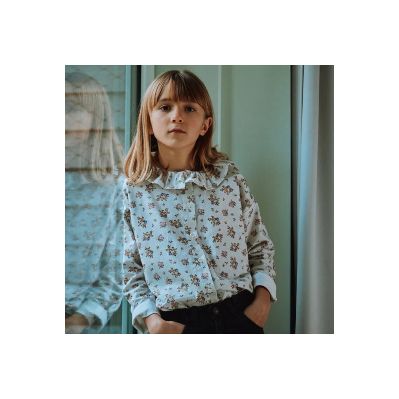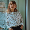 La blouse Colchique de la marque Poudre Organic en coton bio séduit par son col volanté et son imprimé fleuri rose gris.