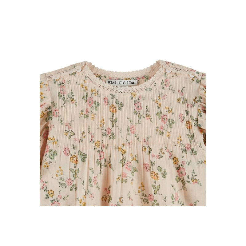 La blouse imprimé Rosier séduit par son charme délicatement rétro. Confectionnée dans une matière légère et fluide, elle est sublimée par un imprimé floral aux tons doux et lumineux. Les fines fronces sur le buste apportent du volume et du mouvement, tandis que l’encolure délicatement travaillée souligne son esprit raffiné. Une pièce poétique et intemporelle, parfaite pour illuminer le quotidien.