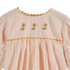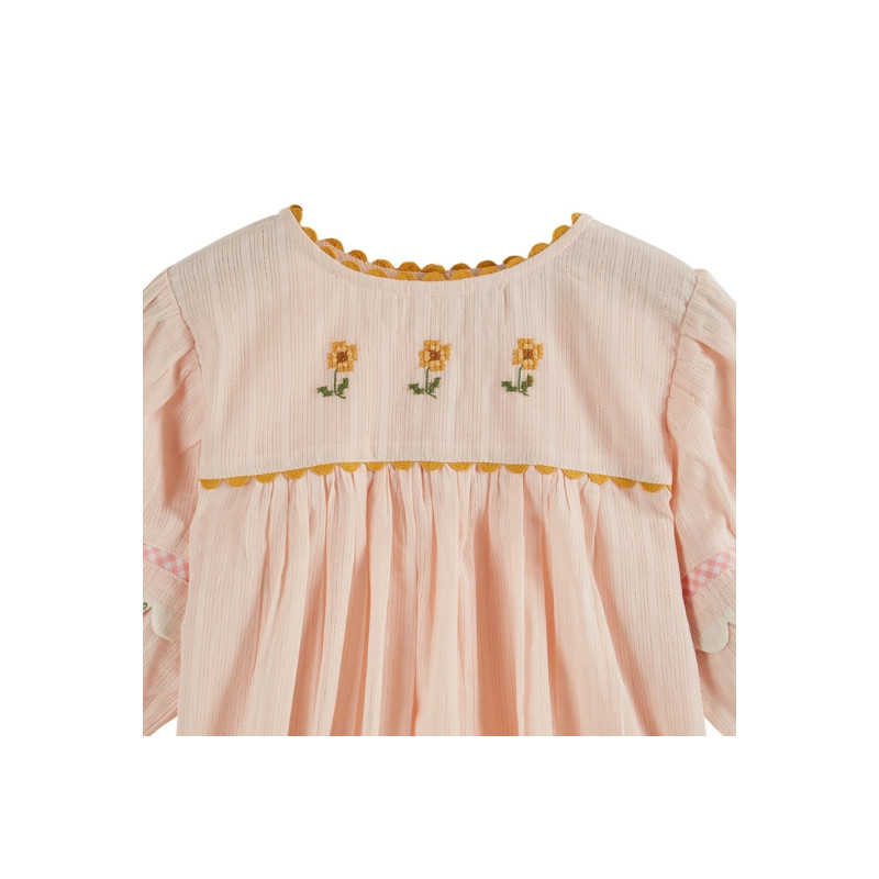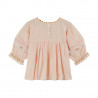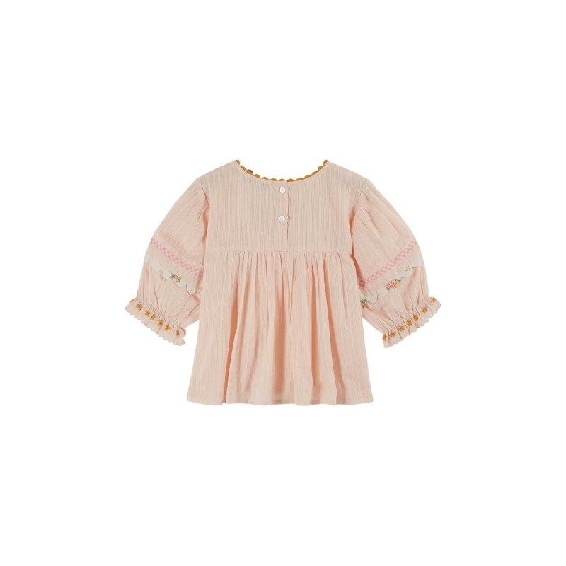 La Blouse Brodée Coquillage charme par sa teinte poudrée et ses détails délicats. Confectionnée dans une matière légère et subtilement texturée, elle présente un plastron brodé de petites fleurs, souligné d’un galon contrasté. Les manches longues légèrement bouffantes sont ornées de finitions festonnées, de touches vichy et de broderies délicates aux poignets. Sa coupe ample et fluide apporte confort et élégance, pour une silhouette romantique pleine de douceur.