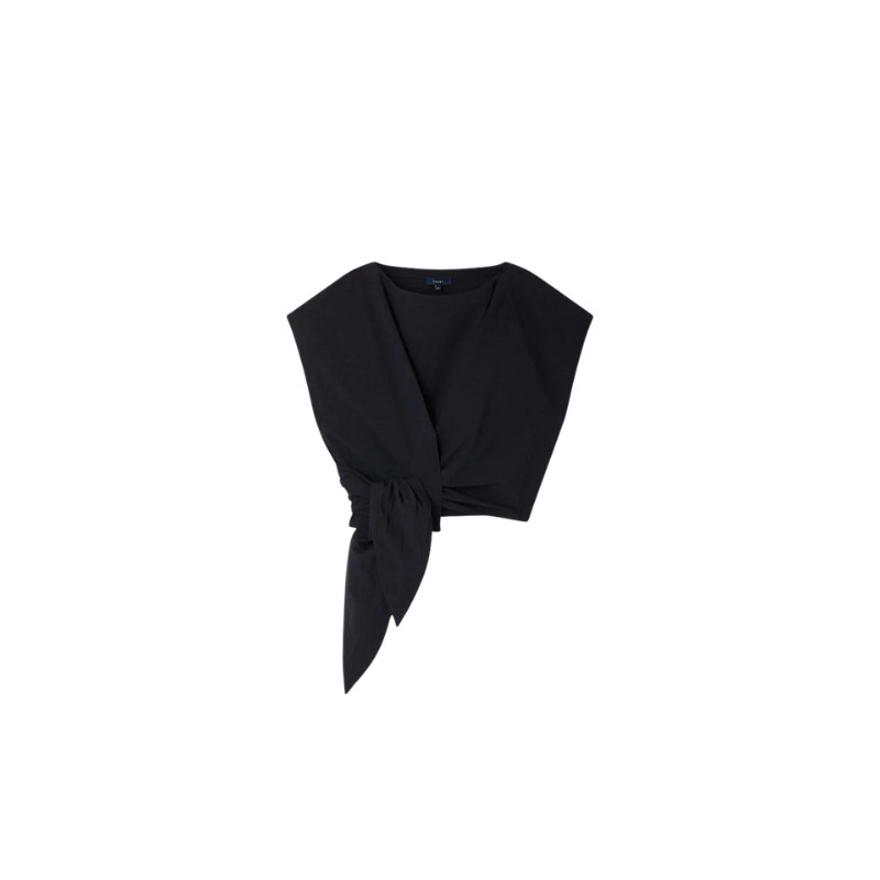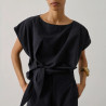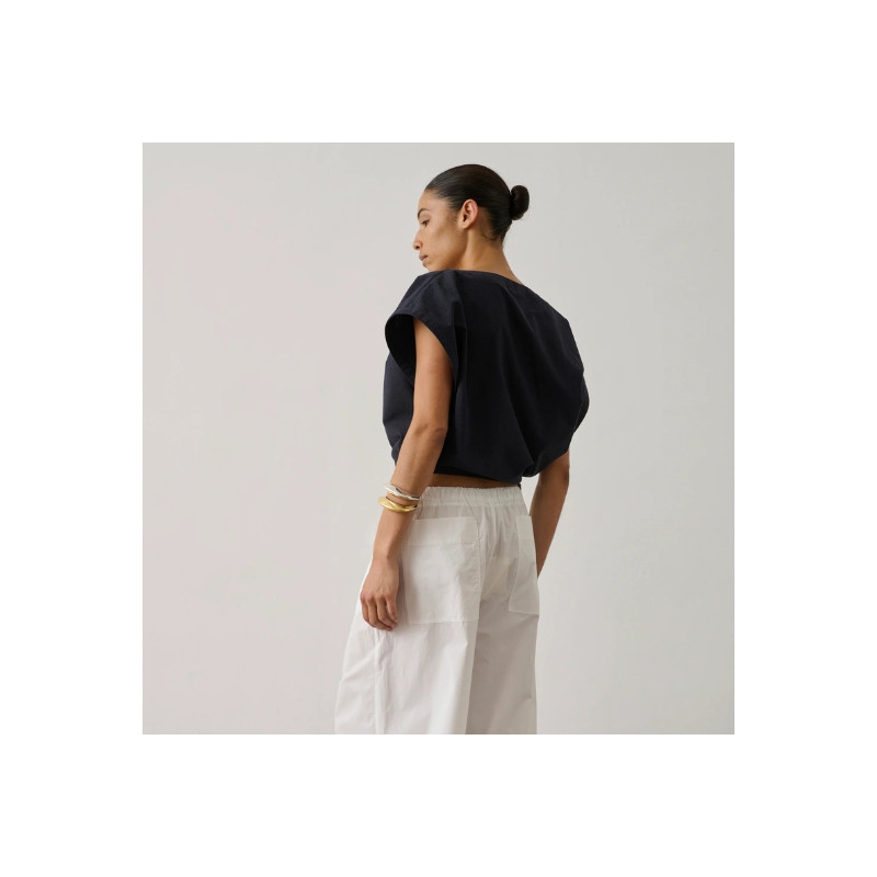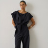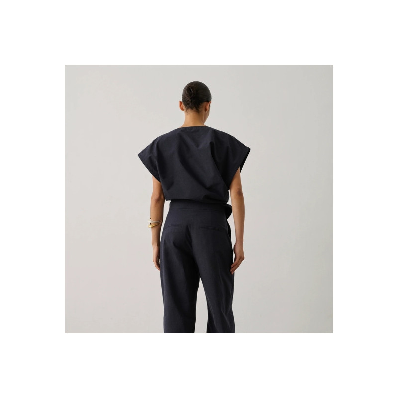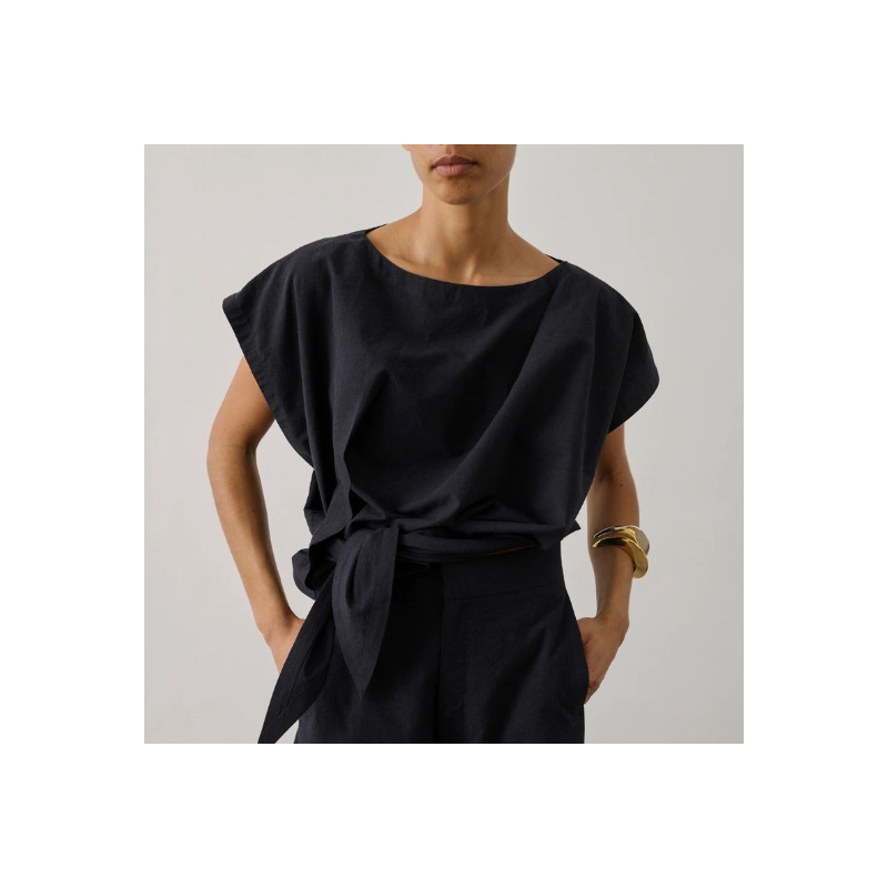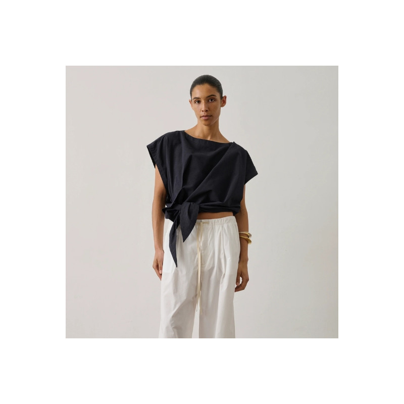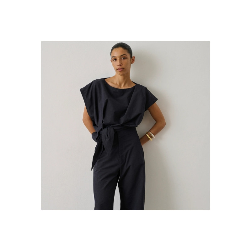 Ce top séduit par sa coupe ample au volume légèrement arrondi qui apporte de la modernité à la silhouette. Sa longueur courte met la taille en valeur, tandis que le système de nœud sur le côté crée un joli jeu de drapé et structure la pièce avec élégance. Confectionné dans un crêpe mêlant lin et viscose, il offre un tombé fluide et une texture naturelle agréable à porter. Léger et facile à associer, il accompagne aussi bien un pantalon taille haute qu’une jupe pour une silhouette estivale simple et raffinée. Fabriqué en Bulgarie.
