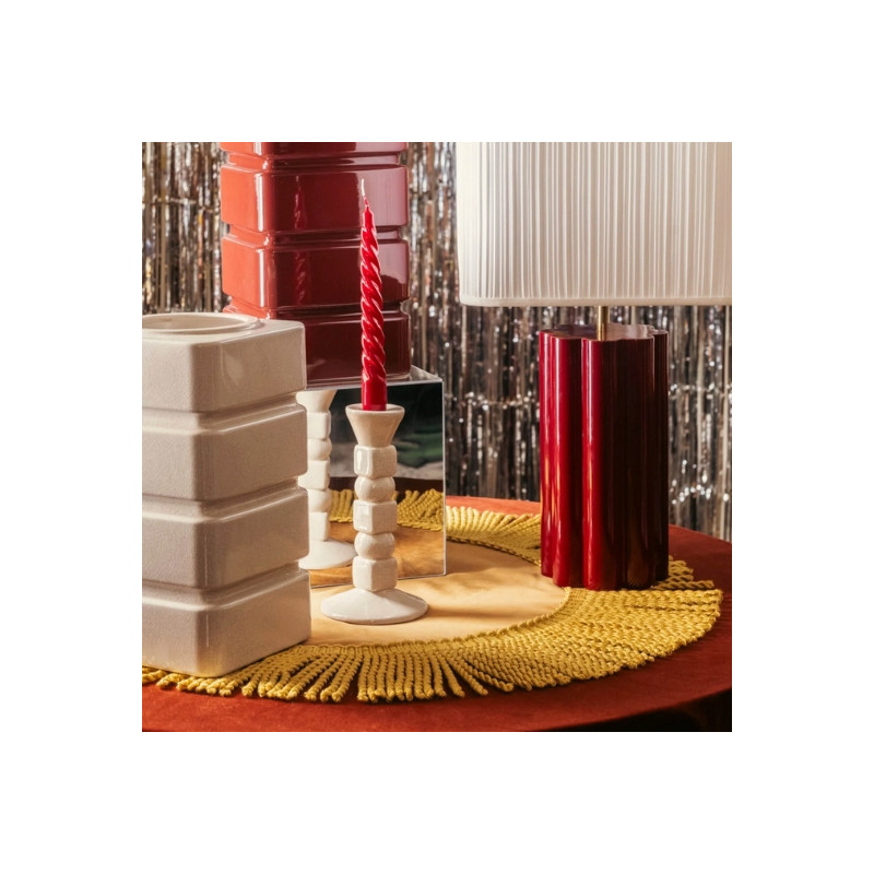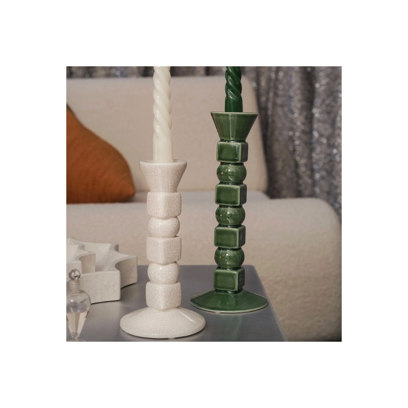 Ce chandelier en céramique blanc crème séduit par son élégante finition en émail brillant craquelé, qui lui apporte un charme délicat et intemporel. Conçu pour accueillir un cierge de taille standard (Ø 2,2 cm), il est équipé de 4 patins en feutre afin de garantir stabilité et protection des surfaces. Fabriqué en Italie, il allie qualité artisanale et style raffiné.