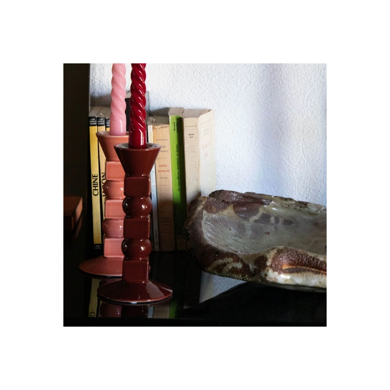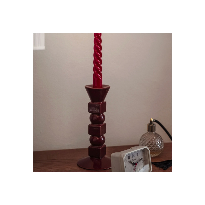 Ce chandelier en céramique bordeaux se distingue par sa finition en émail brillant, à la fois élégante et chaleureuse. Compatible avec un cierge de taille standard (Ø 2,2 cm), il est doté de 4 patins en feutre pour protéger vos surfaces et assurer une parfaite stabilité. Fabriqué au Portugal, il apporte une touche raffinée à votre décoration.